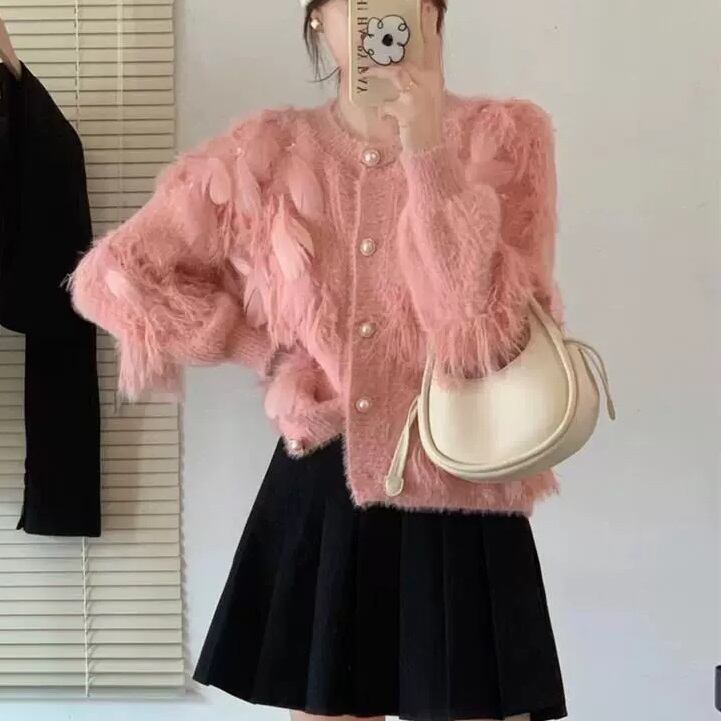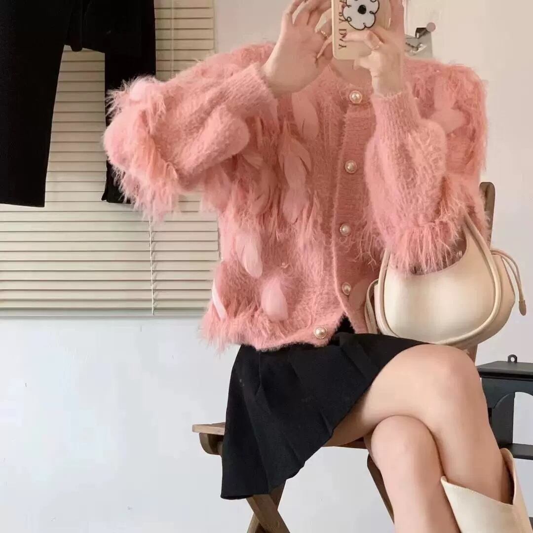 フェザー+パールデコレーション モヘアニットカーディガン ローズピンク NI00369