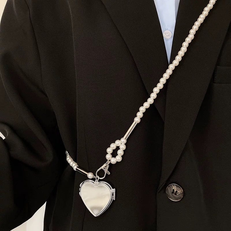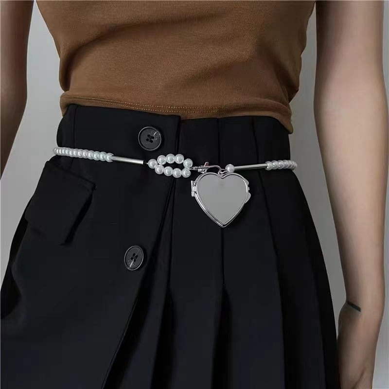 ガラスパールとハートのロケットチャームのコンビネーションがスタイリッシュなハーネス・デザインベルトです。斜めがけをしてハーネスとして、ウエストに巻けばベルトとして、コーデに合わせて幅広いスタイリングが楽しめます。プラスするだけでいつものコーデがぐっと華やかになります。ジャケット、ワンピース、ニット、ブラウス、幅広いアイテムに良く似合います。ちょっと鏡を見たい時に便利なロケットチャーム付きです。