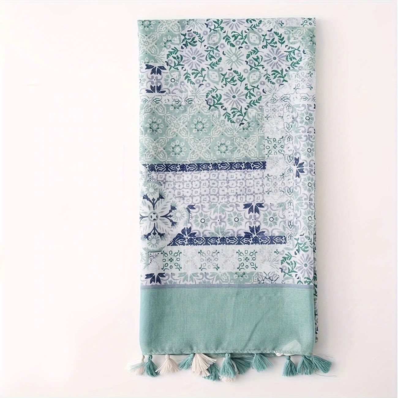 ボヘミアンなカラーリングとパターンがポイントのタッセル付きのショール・ストールです。巻き方によって雰囲気がかわり、スタイルに合わせてアレンジが楽しめます。少し肌寒い時に首に巻いたり、羽織ったり、ひざ掛けとしてもお使いいただけます。