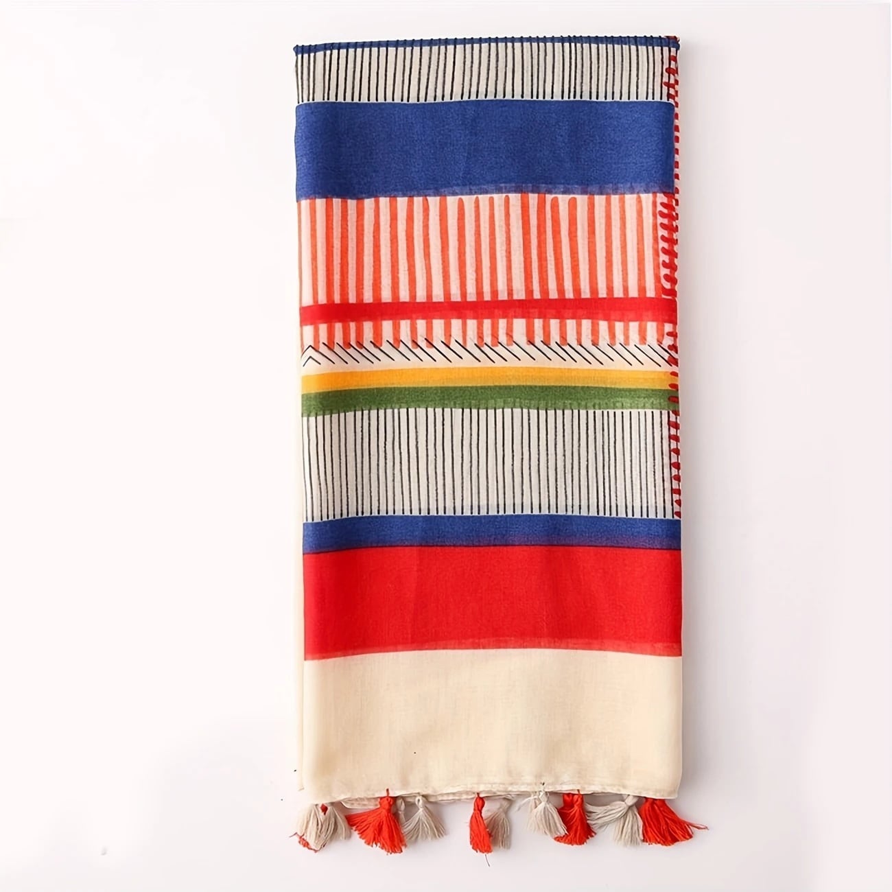 ボヘミアンなカラーリングとパターンがポイントのタッセル付きのショール・ストールです。巻き方によって雰囲気がかわり、スタイルに合わせてアレンジが楽しめます。少し肌寒い時に首に巻いたり、羽織ったり、ひざ掛けとしてもお使いいただけます。