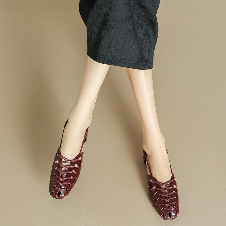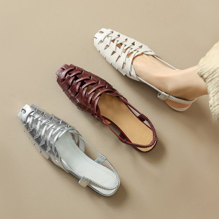 リアルレザーをエレガントに編み込んだスリングバックタイプのフラットサンダルです。レースアップのように編み込まれたレザーの隙間から見える素肌が春夏のスタイルをヘルシー&エレガントに演出します。使うたびに肌になじむソフトなレザーがしっかり脚を包み込み、スリングバックとフラットヒールで歩きやすさも◎です。レッグウエアとのレイヤードも楽しめます。