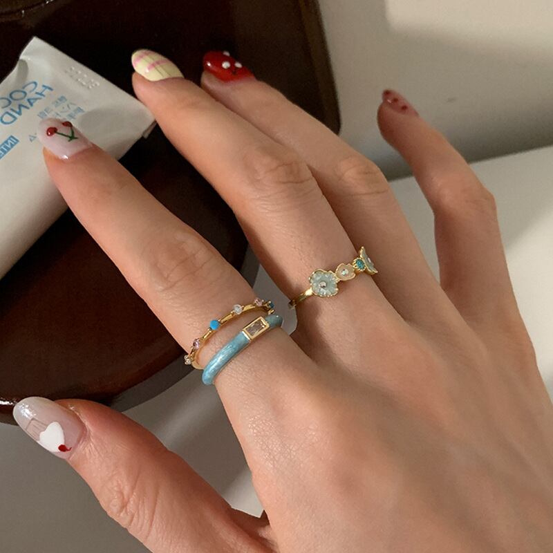 フラワー+マルチカラージルコニア+ターコイズのオープンリング3本セットです。ブルーとピンクをベースとしたお花のリングと、ターコイズ、ピンク、クリアのジルコニアをアレンジしたデザインリング、ターコイズにクリアジルコニアをアレンジしたリングの3本セットです。それぞれ単品でも、重ね付けも楽しめます。繊細なデザインが女性らしい指先に仕上げてくれます。オープンリングですので、スタイルや気分に合わせて着用する指をかえて、アレンジが楽しめます。
