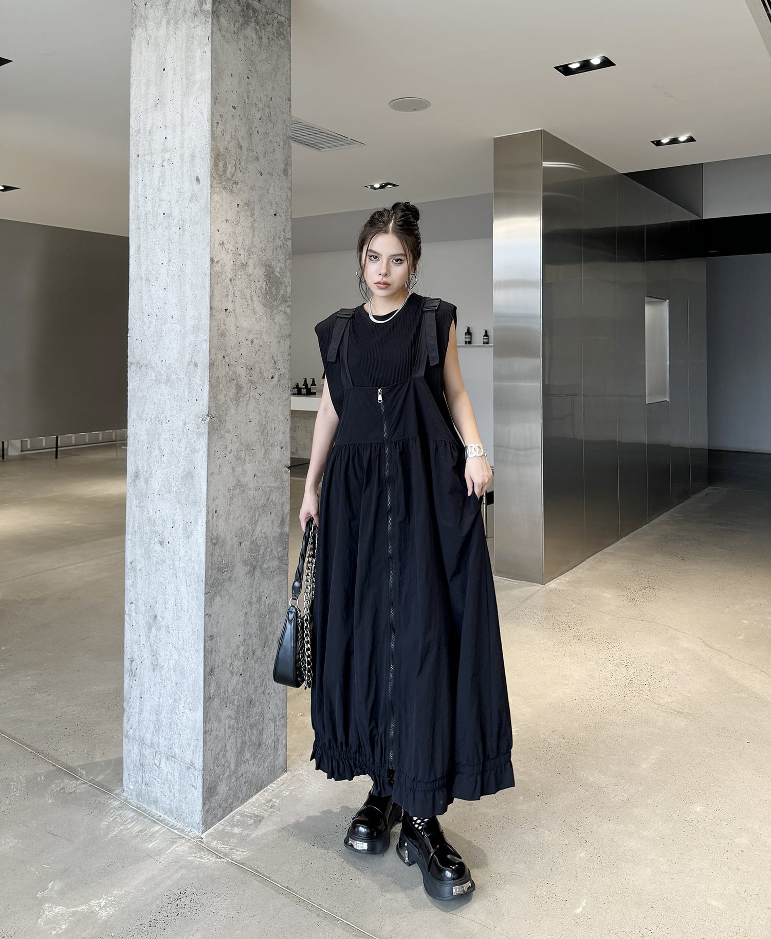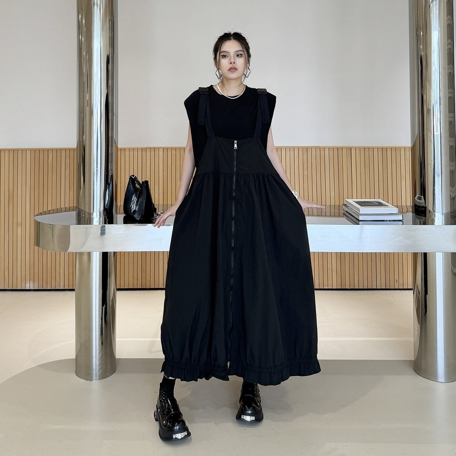 フロントジッパー サスペンダーワンピース・ジャンパースカート ブラック OP00363
