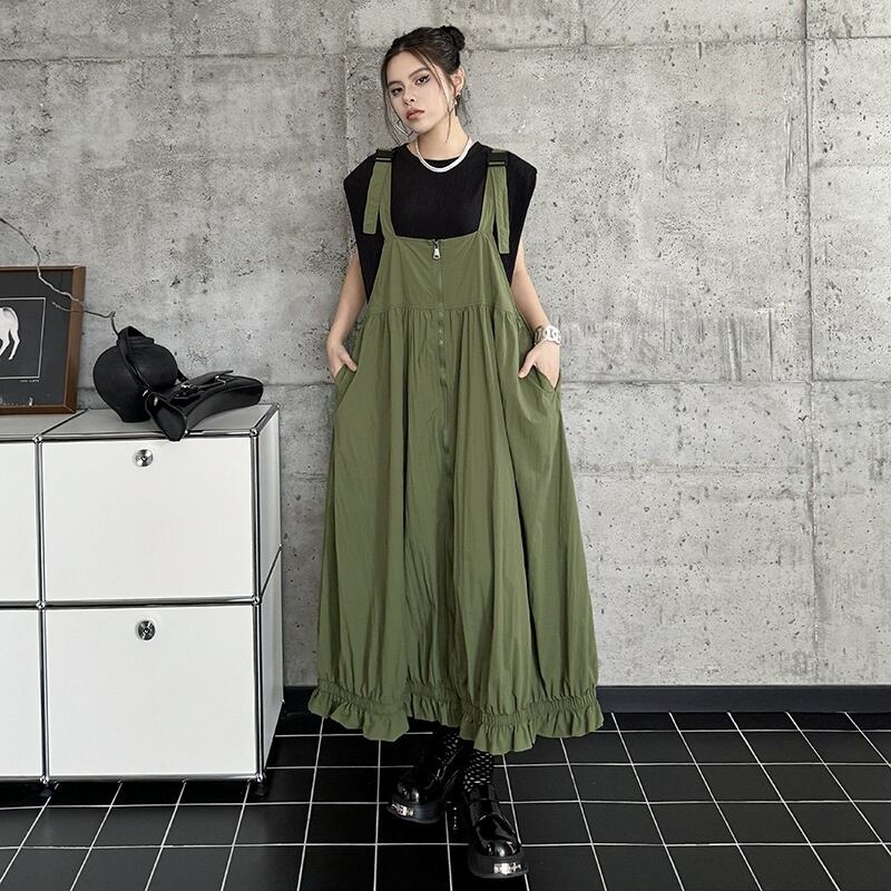 フロントジッパー サスペンダーワンピース・ジャンパースカート モスグリーン OP00362