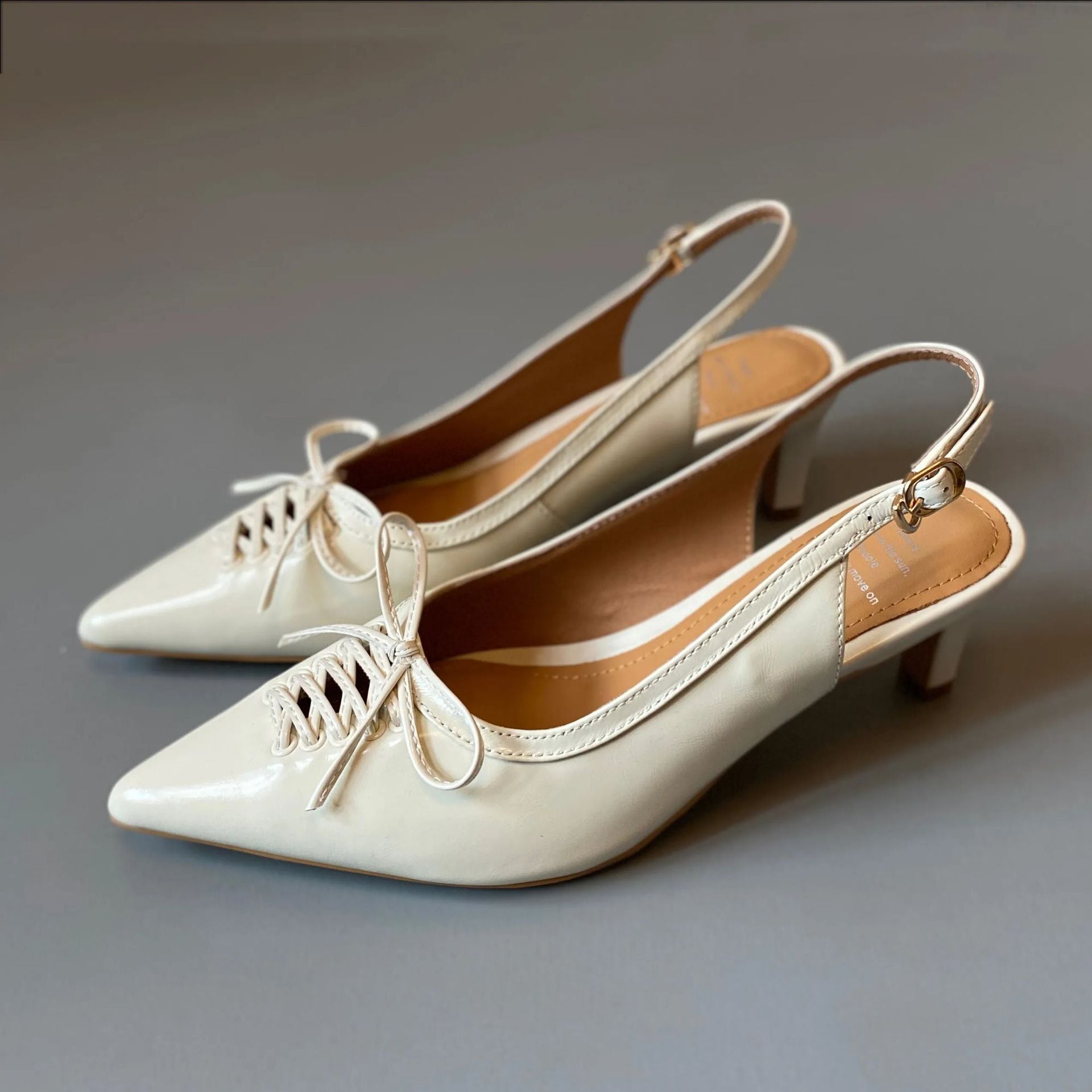 レースアップリボン スリングバック レザーヒールパンプス アイボリー SH00376