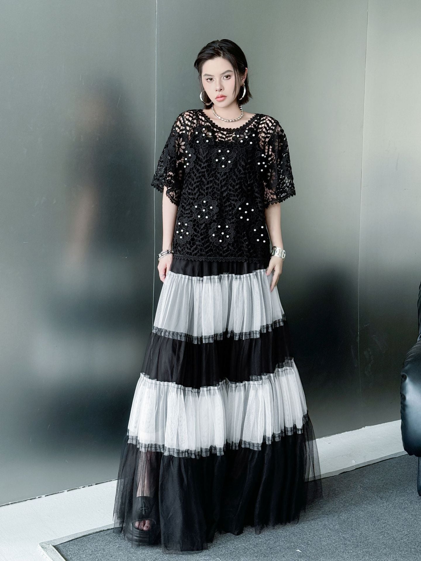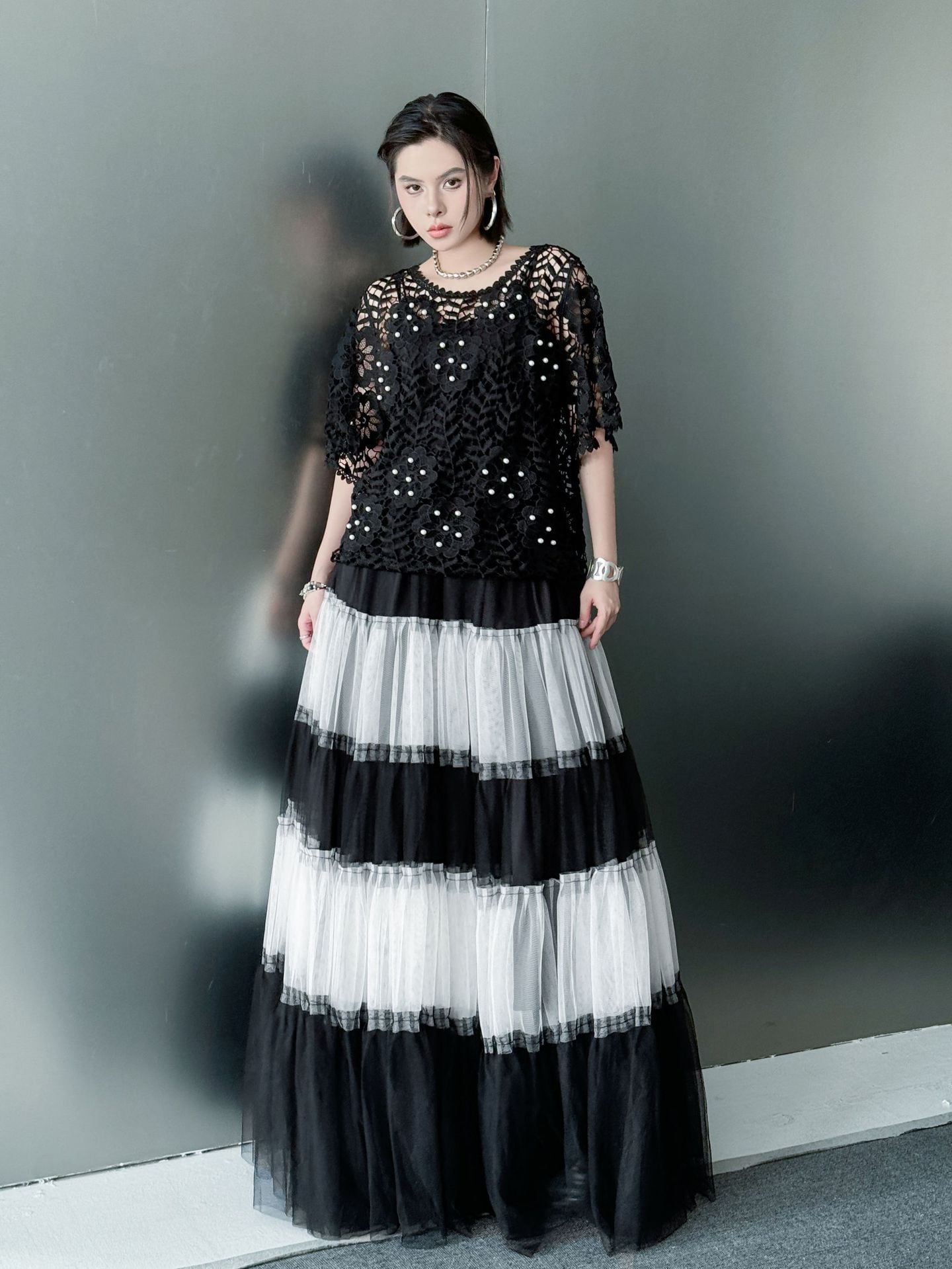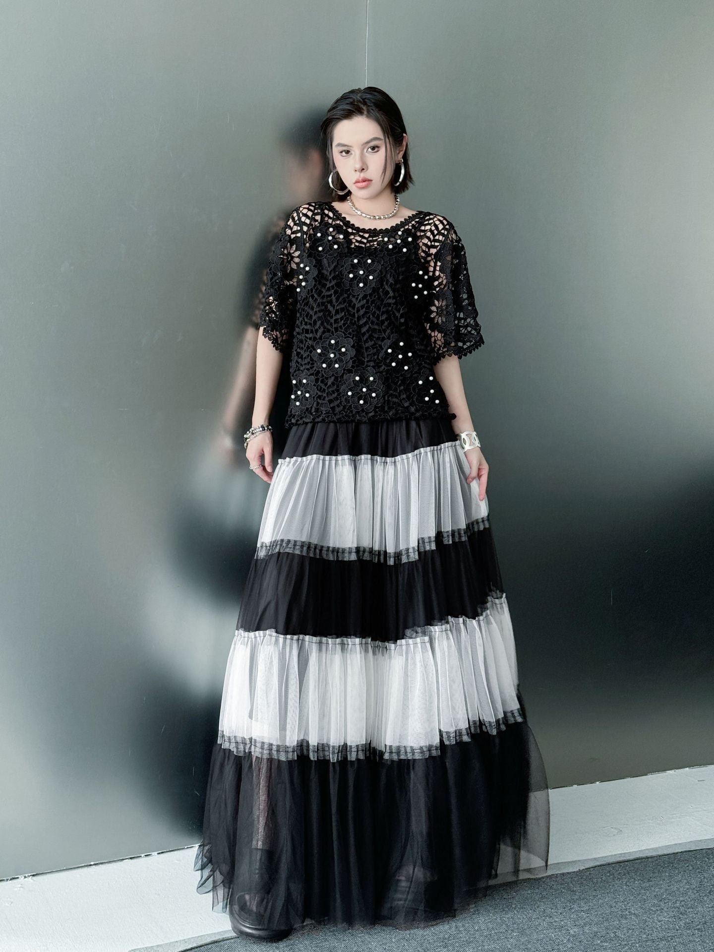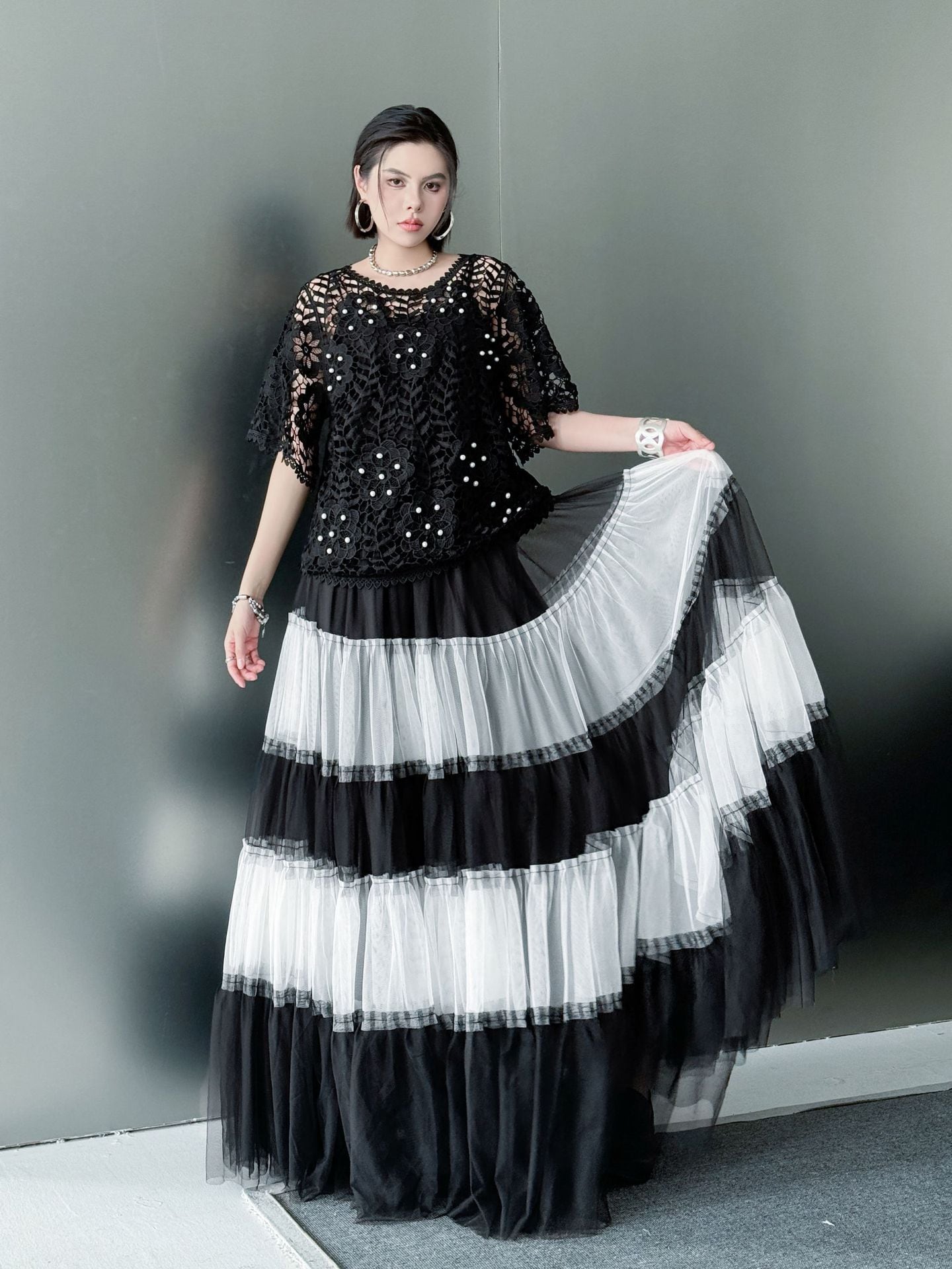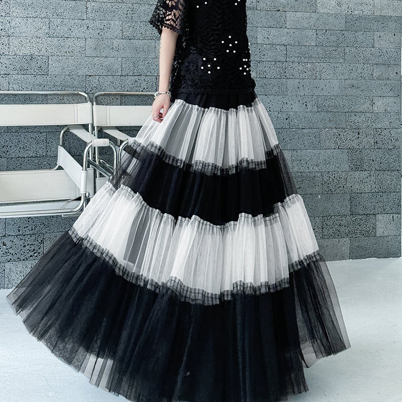 ブラックとホワイトのモノトーンボーダーがスタイリッシュなチュールのマキシスカートです。チュールレイヤーが織りなすボリュームのあるシルエットと、シックなカラーリングで、通常のチュールスカートよりもシックな雰囲気に仕上がります。パンツやタイツ、ソックスなどを重ねても、ユニークなスタイリングが楽しめます。