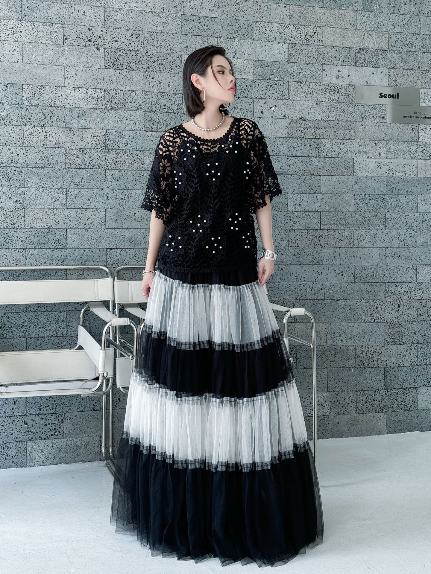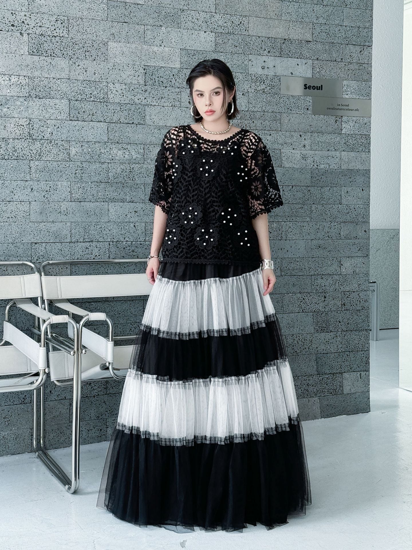 モノトーンボーダー ボリューミーマキシ チュールスカート SK00261