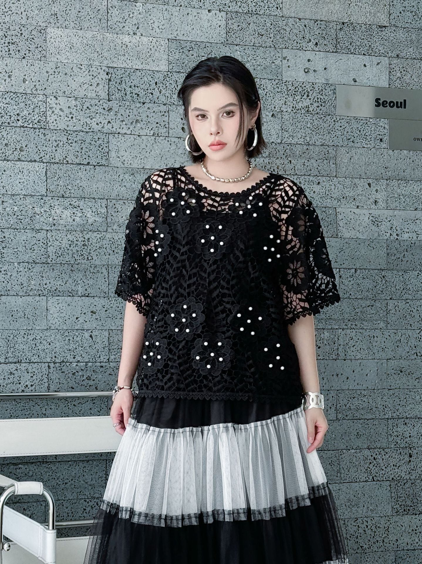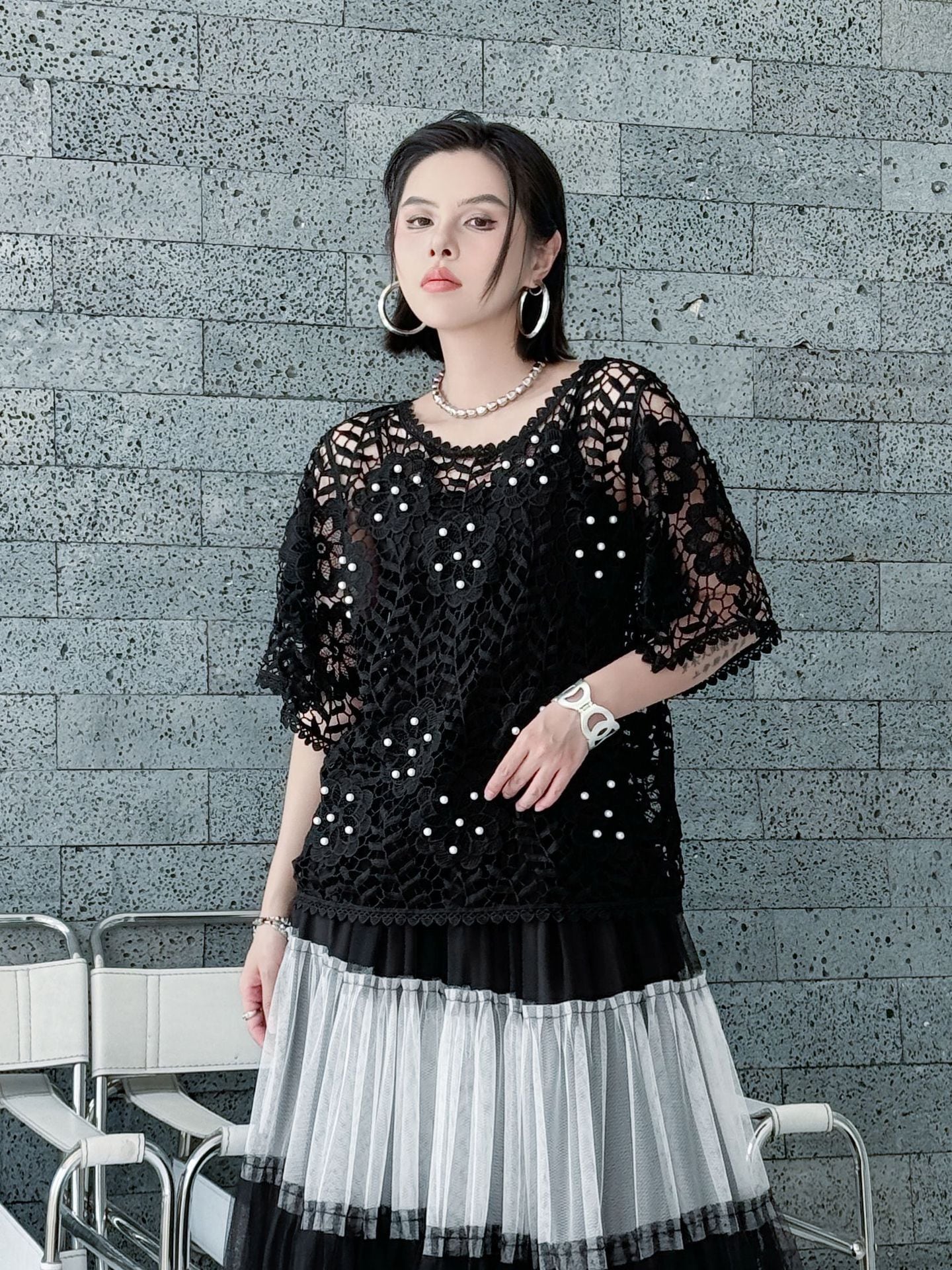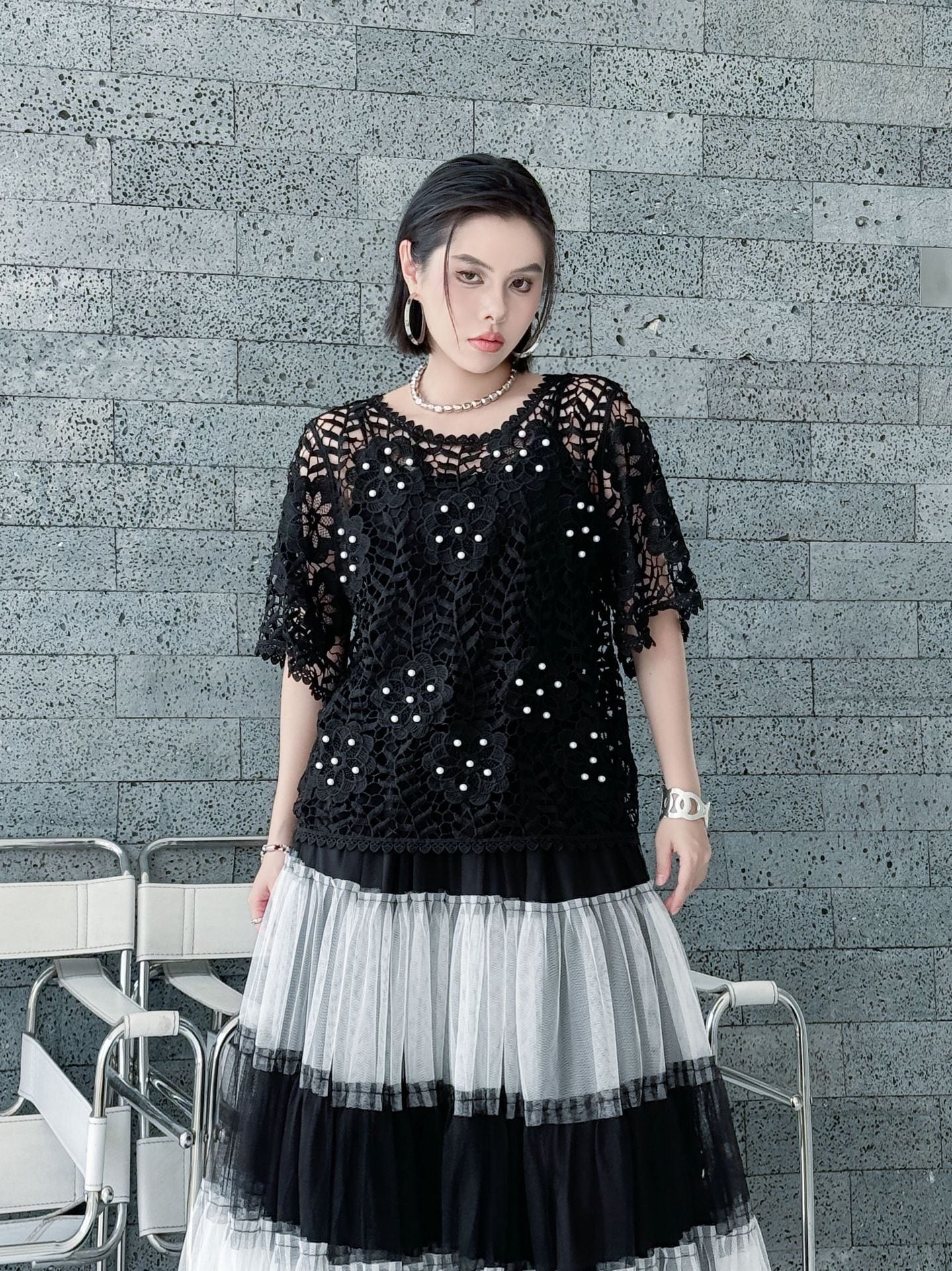 フラワーレース+ビーズアレンジ 透かし編み デザインニットトップス ブラック NI00405