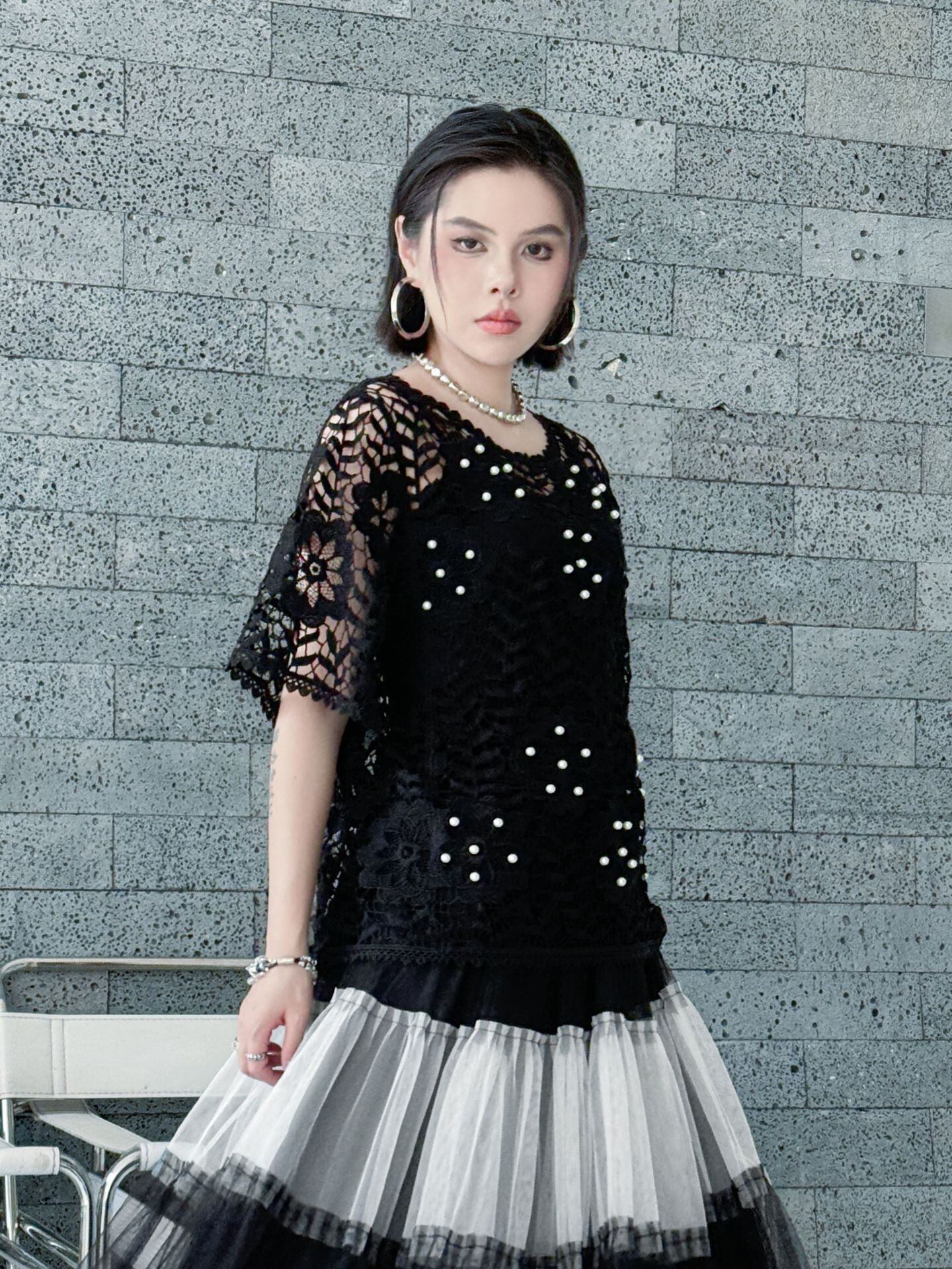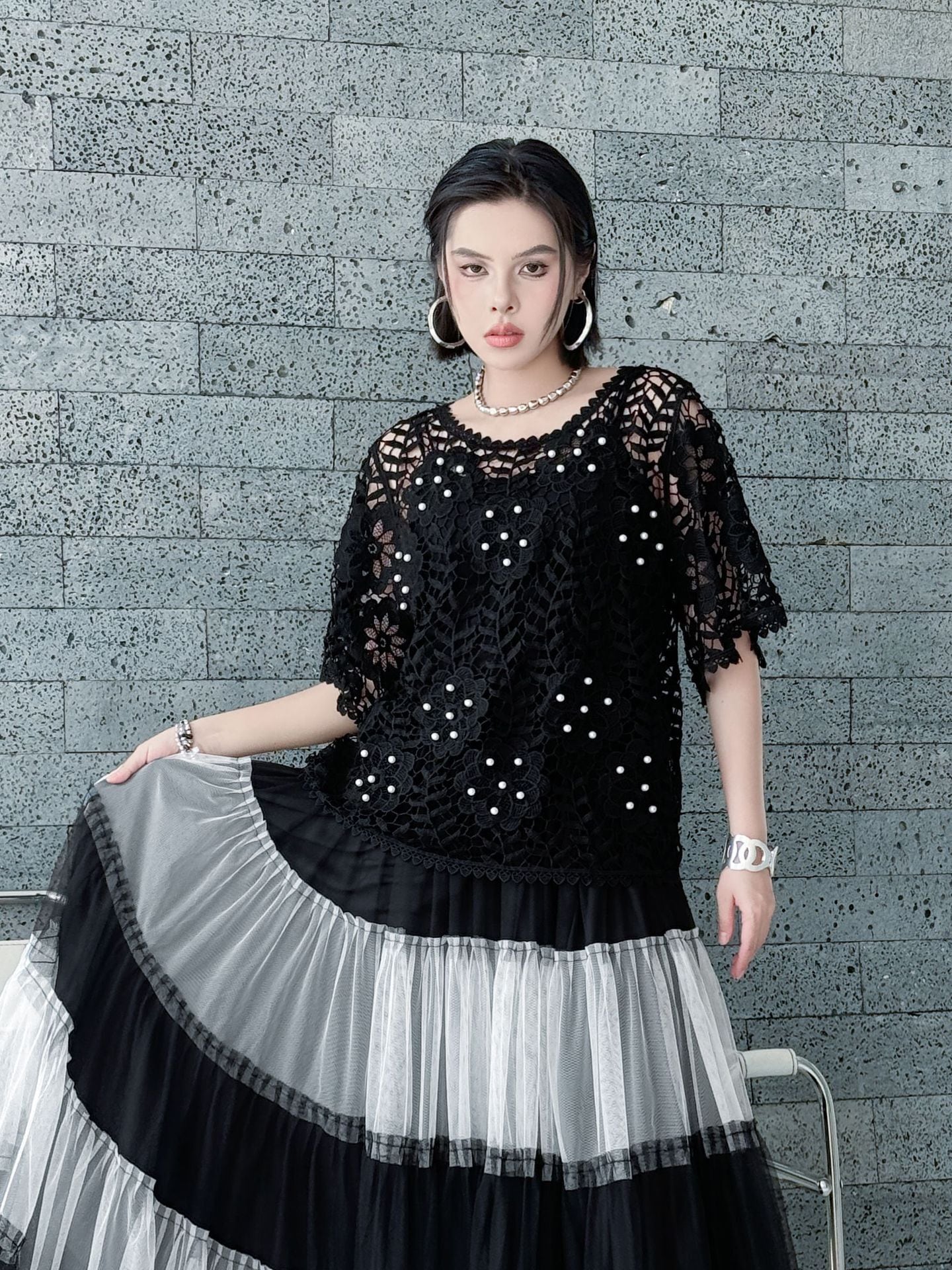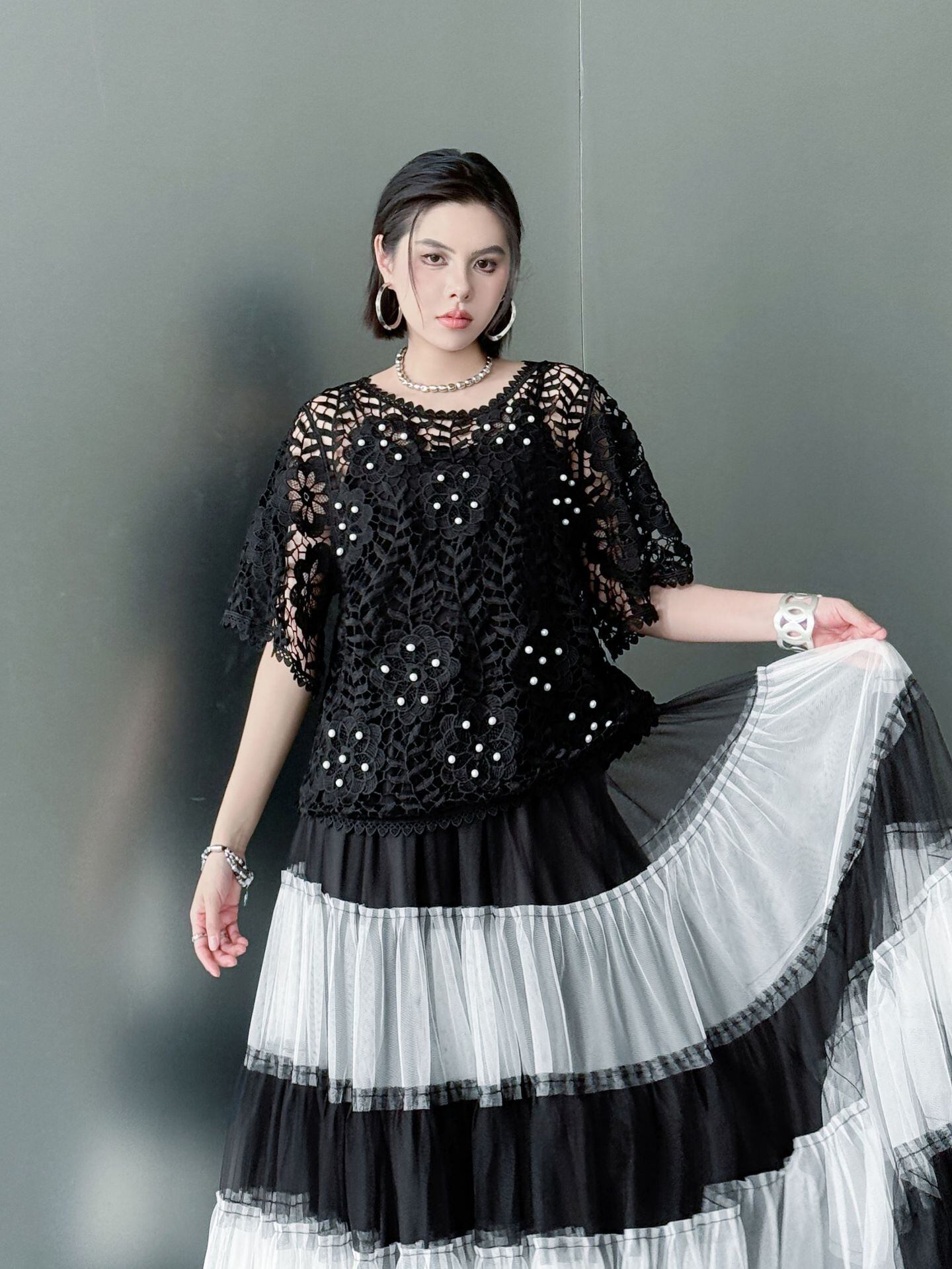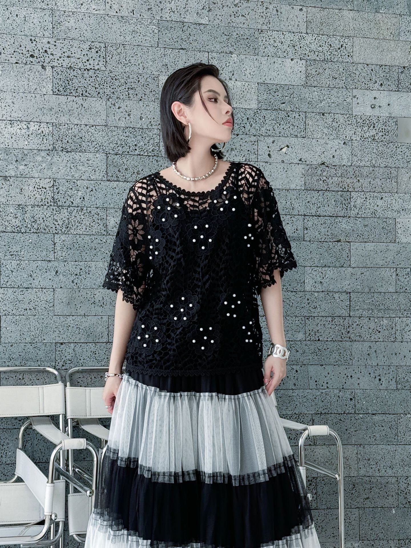 フラワーレース+ビーズアレンジ 透かし編み デザインニットトップス ブラック NI00405