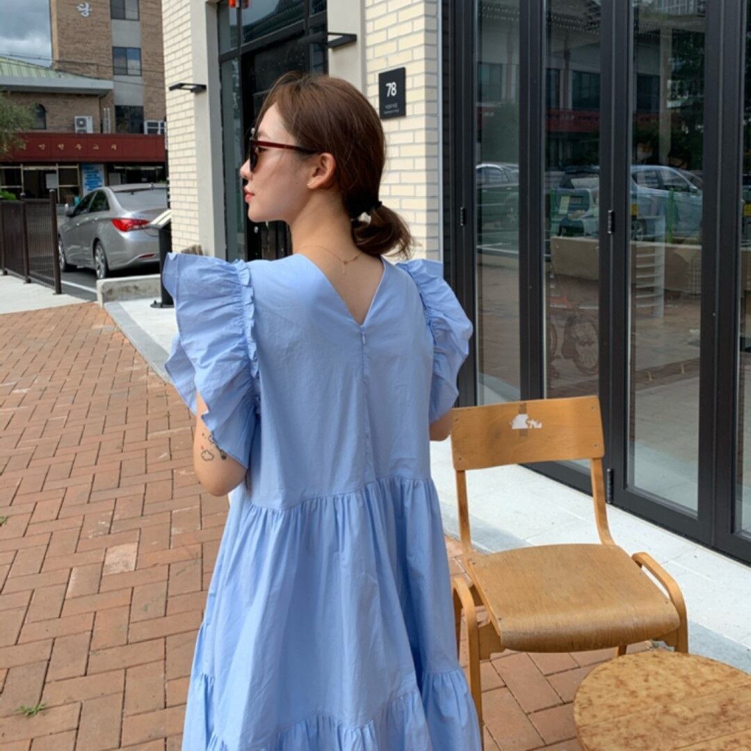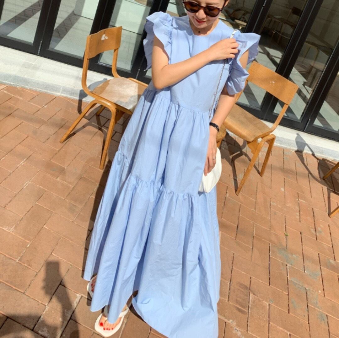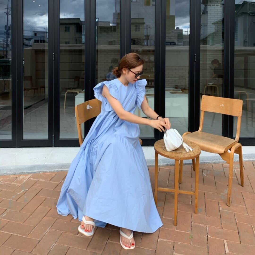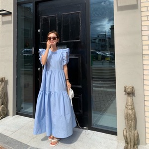フリルスリーブ ロングフレアワンピース ライトブルー OP00380
