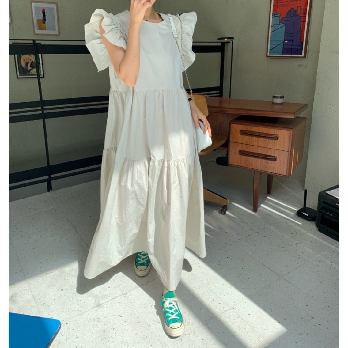 フリルスリーブ ロングフレアワンピース クリームイエロー OP00382