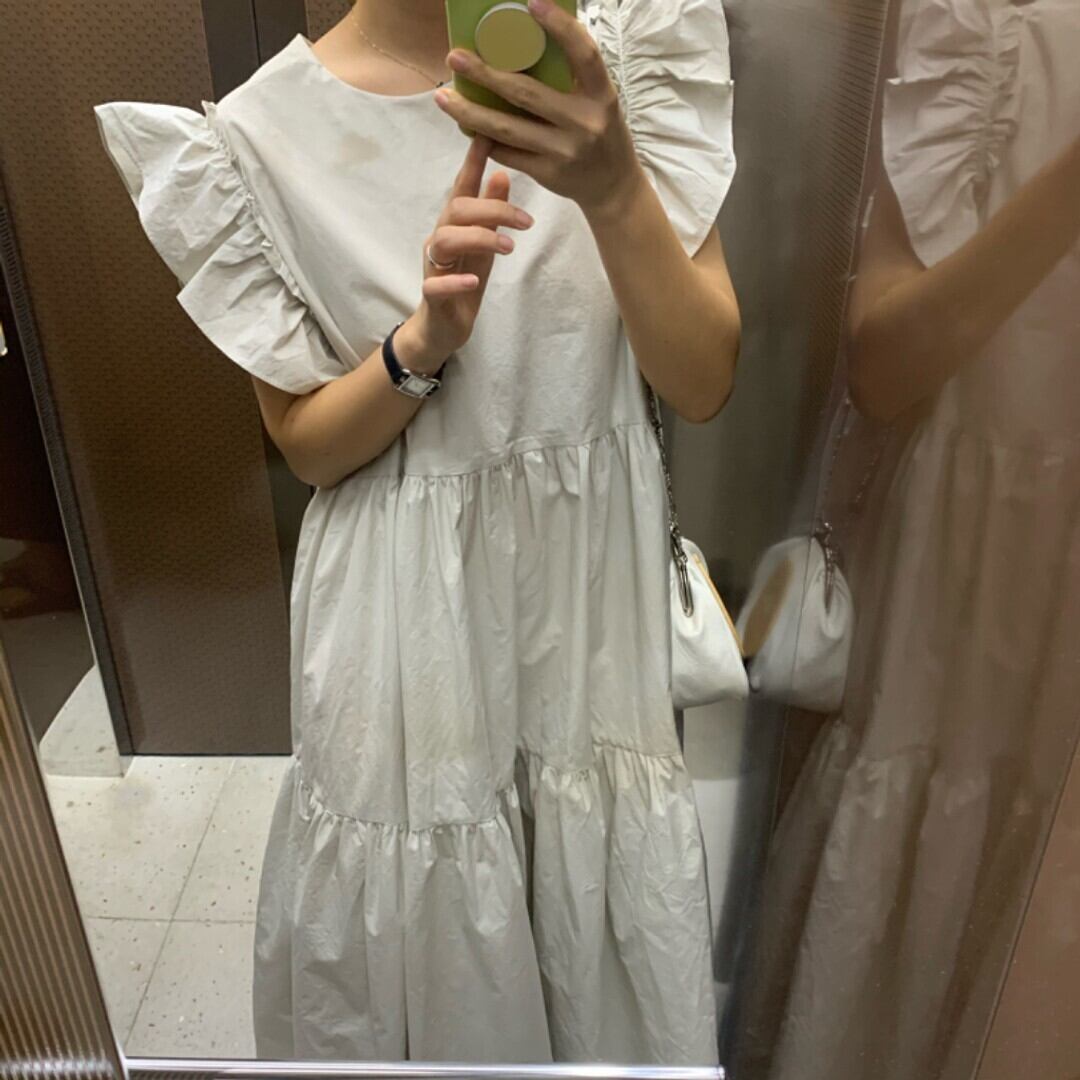 ワイドフリルがポイントのノースリーブのロングフレアワンピースです。ウエストとヒップ下に入ったシャーリングでフェミニンなシルエットに仕上がります。涼しく過ごせて、夏のムードにぴったりのカラーリングとデザインです。