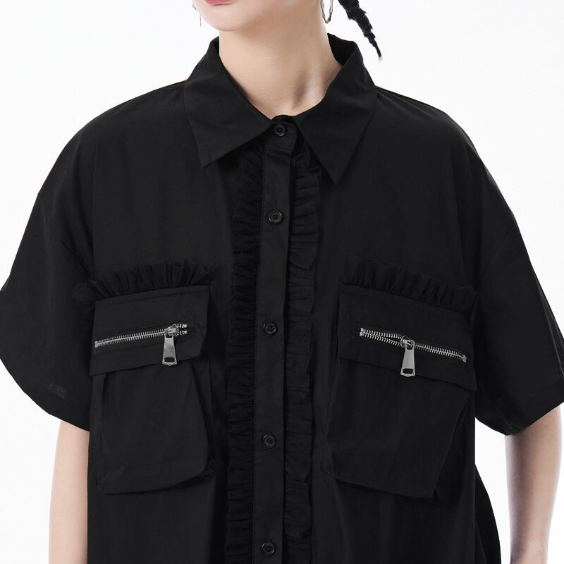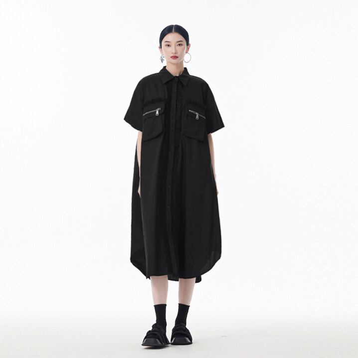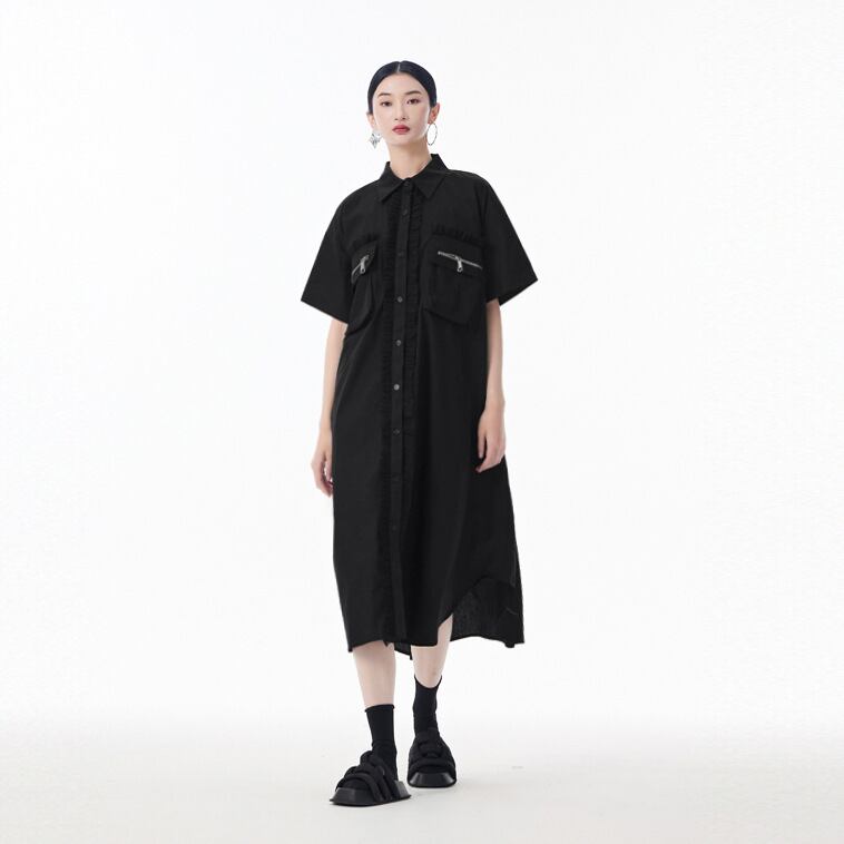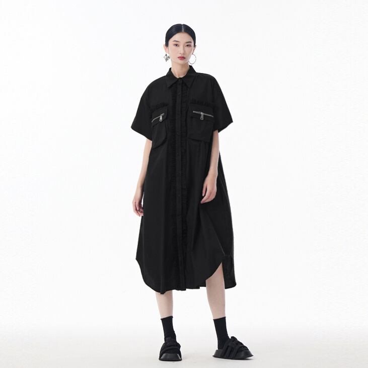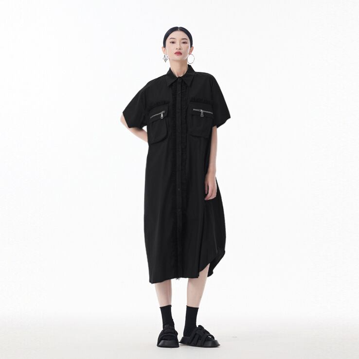 フリンジ+ジッパーアレンジ 半袖シャツワンピース ブラック OP00370