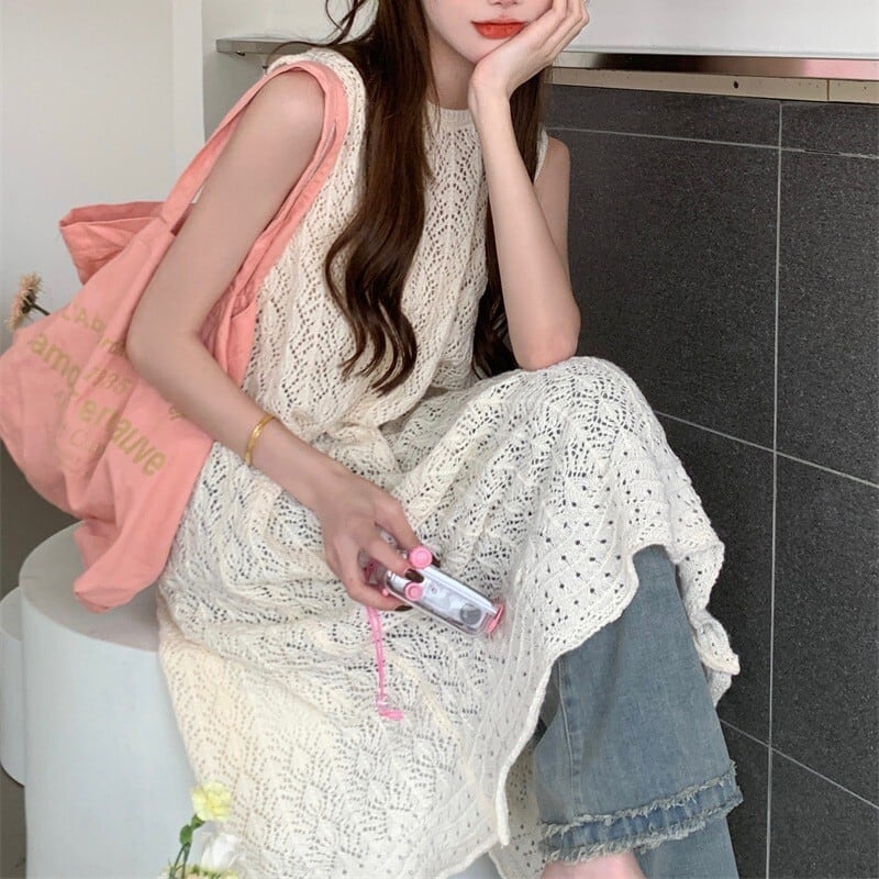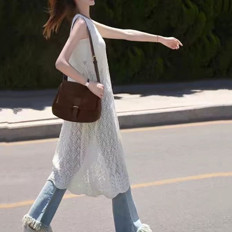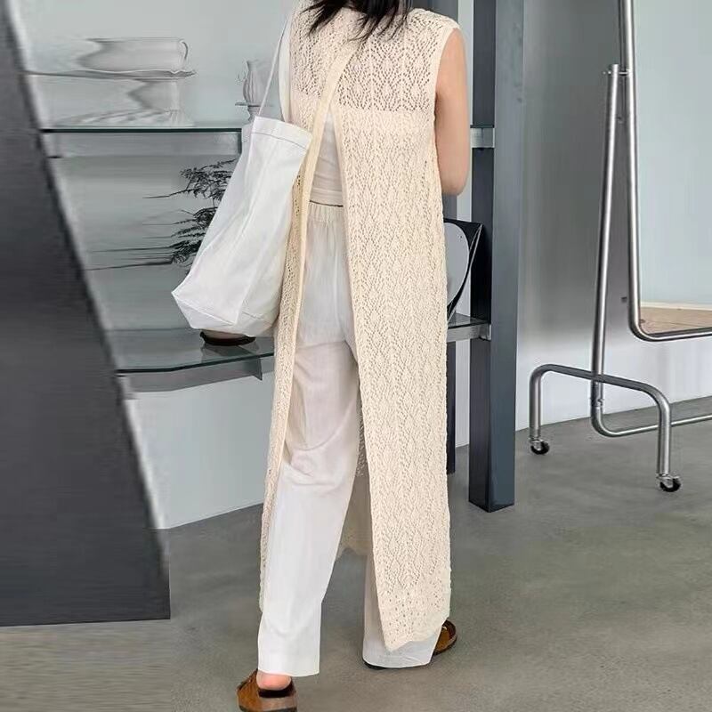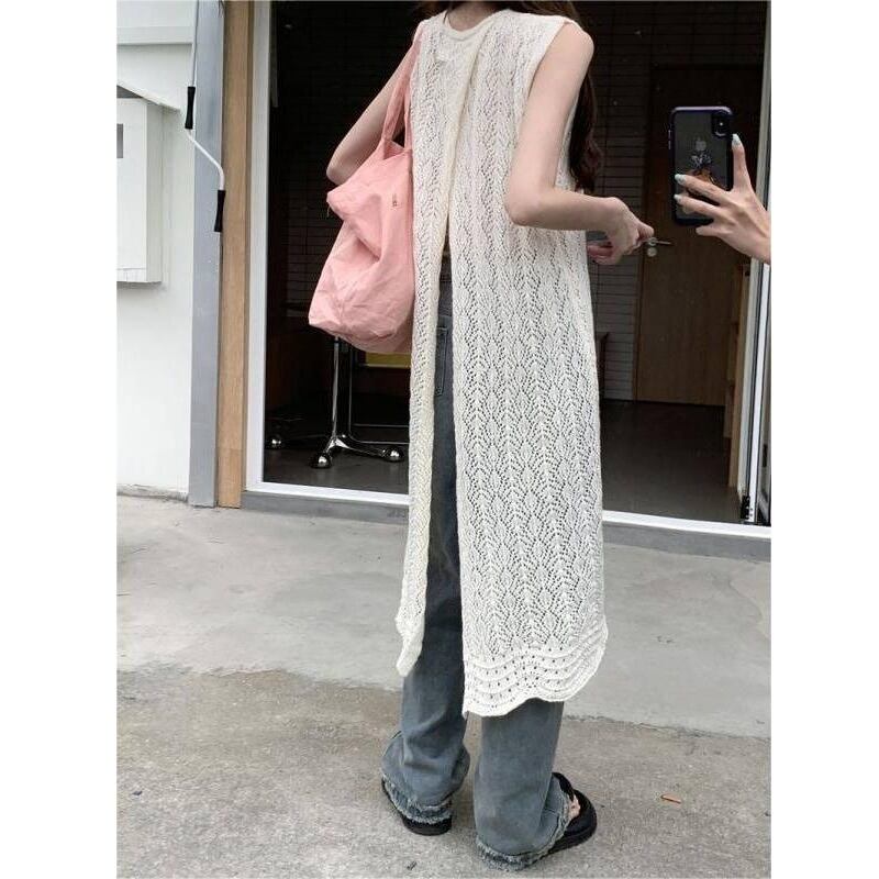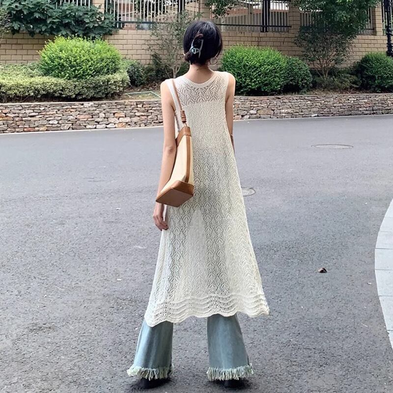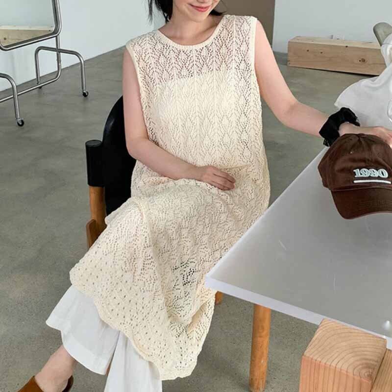 フレンチレースがエレガントなノースリーブのロング丈のベスト・ジレです。パンツ、スカート、ワンピースなどどんなアイテムとも合わせやすく、透け感を活かした上品なレイヤースタイリングが楽しめます。スタイリングに合わせて、リバーシブルにお使いいただけます。水着とのレイヤードスタイルもおすすめです、バカンスにもぴったりのアイテムです。