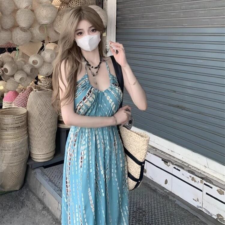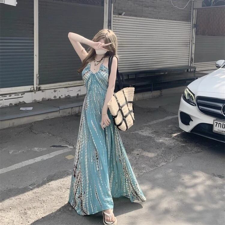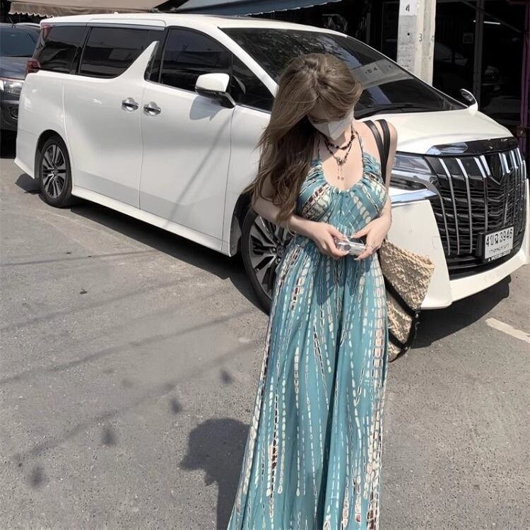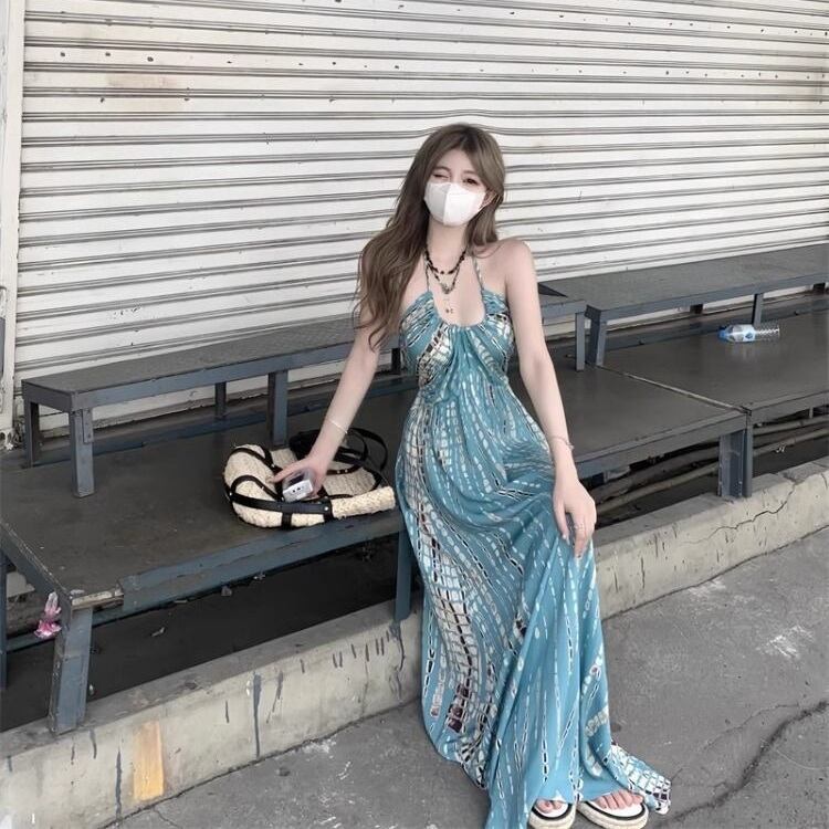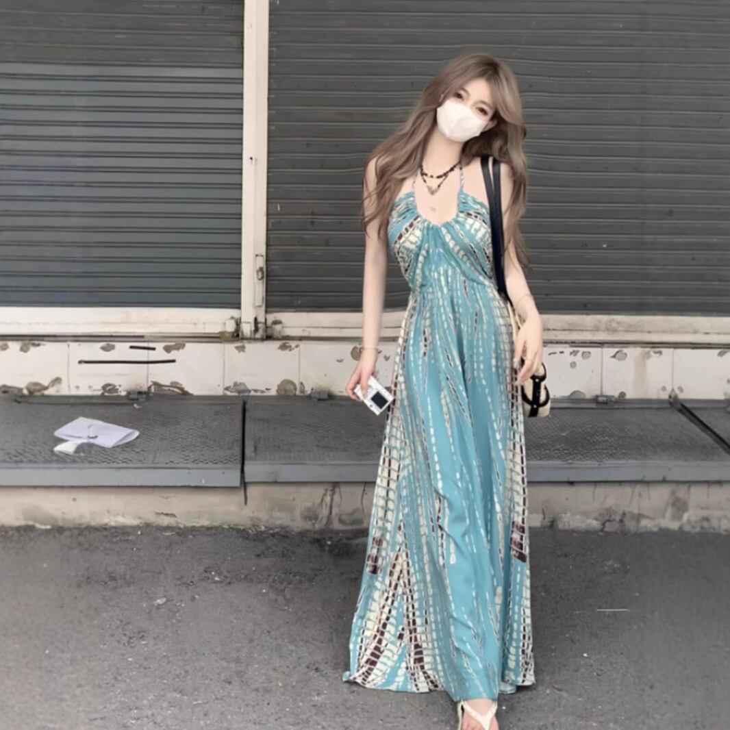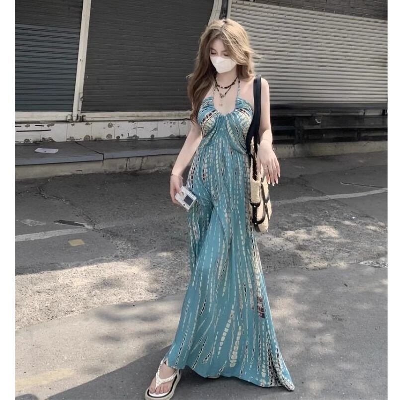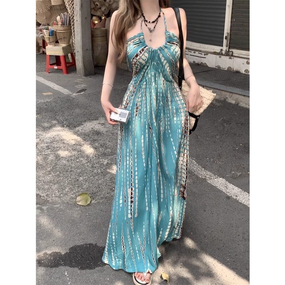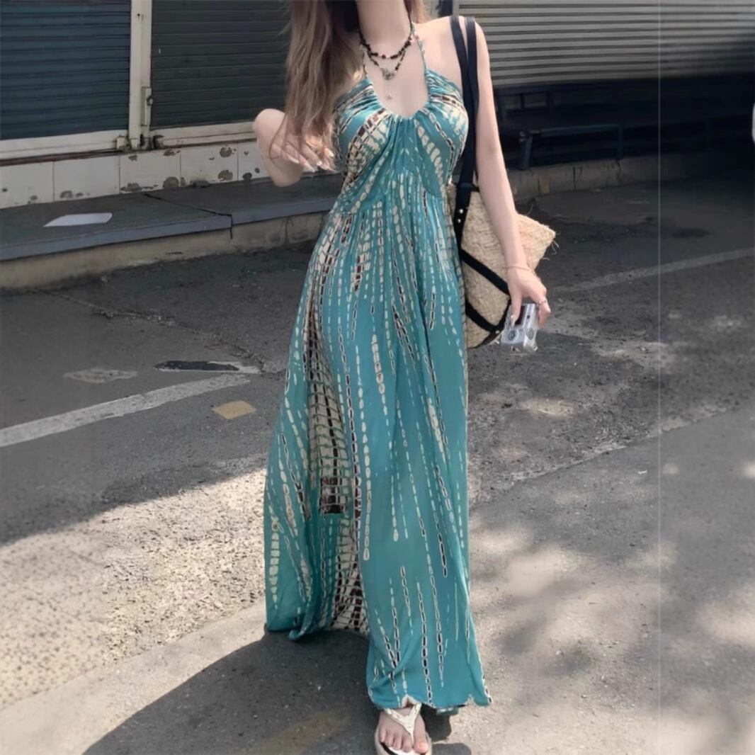 ターコイズのボヘミアンプリントとホルターネックがポイントのキャミソールタイプのマキシワンピースです。細部まで美しいデザインとハイセンスなターコイズのタイダイプリントで、エレガントな雰囲気に仕上がります。真夏のイベントや、リゾートでのバカンスにもぴったりのワンピースです。
