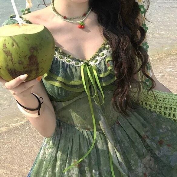 グリーンのボタニカルプリントのシフォン+ホワイトレースのスカートのレイヤードがフェミニンなロングワンピースです。背中のリボンや裾のワイドレース、胸元のレースとリボンづかいなど、細かいところまでロマンティックなデザインです。バカンスや、海やプールなど、楽しいイベントを盛り上げる、主役級ワンピースです!シフォンワンピースとインナーのレーススカートはそれぞれ単品ずつでもスタイリングが楽しめます◎