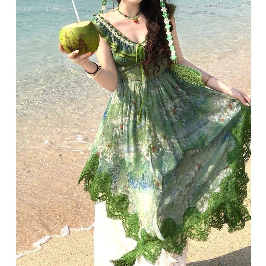 ボタニカルシフォン+レースレイヤード ボヘミアンロングワンピース グリーン OP00388