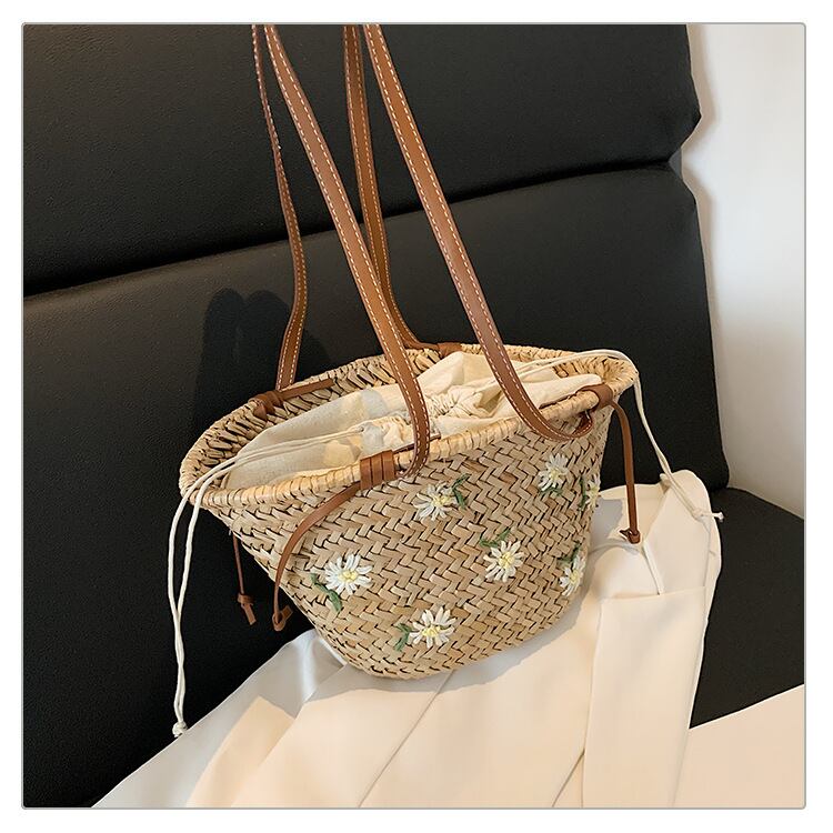 マーガレットの刺繍がフェミニンなストローバッグです。繊細なお花の刺繍とブラウンのストラップで、スタイリッシュな雰囲気に仕上がります。巾着型のインナーバッグ付きで、荷物をすっきりと収納できます。春夏のスタイリングのアクセントにおすすめです!