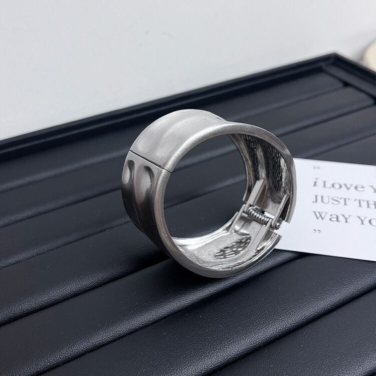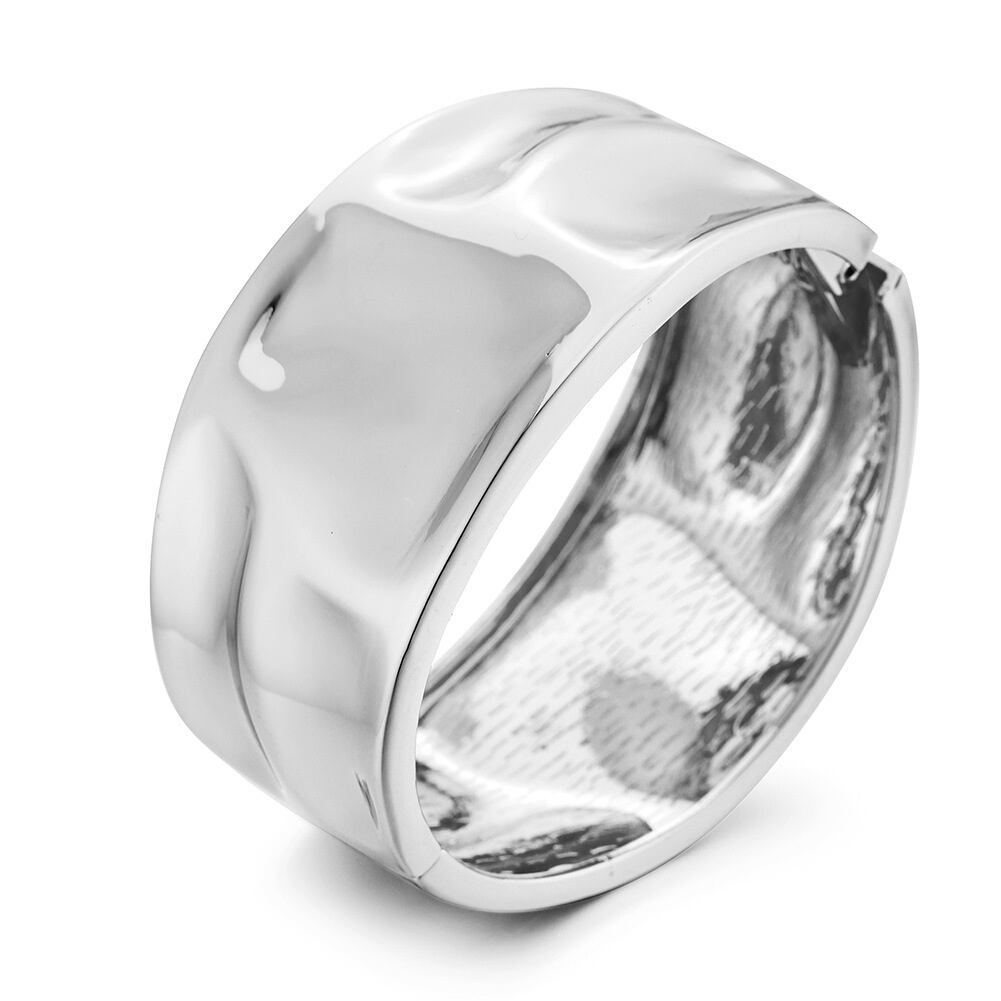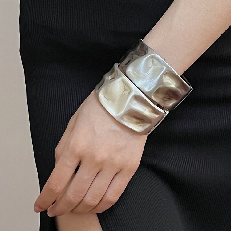 ビートエンボスがスタイリッシュなワイドバングルです。そのまま素肌に着けても、ニットやブラウスの上から着用するのもおすすめです。1年を通して幅広いコーデのアクセントになる、インパクトのあるデザインです。