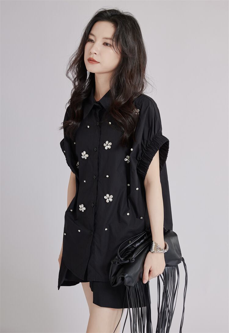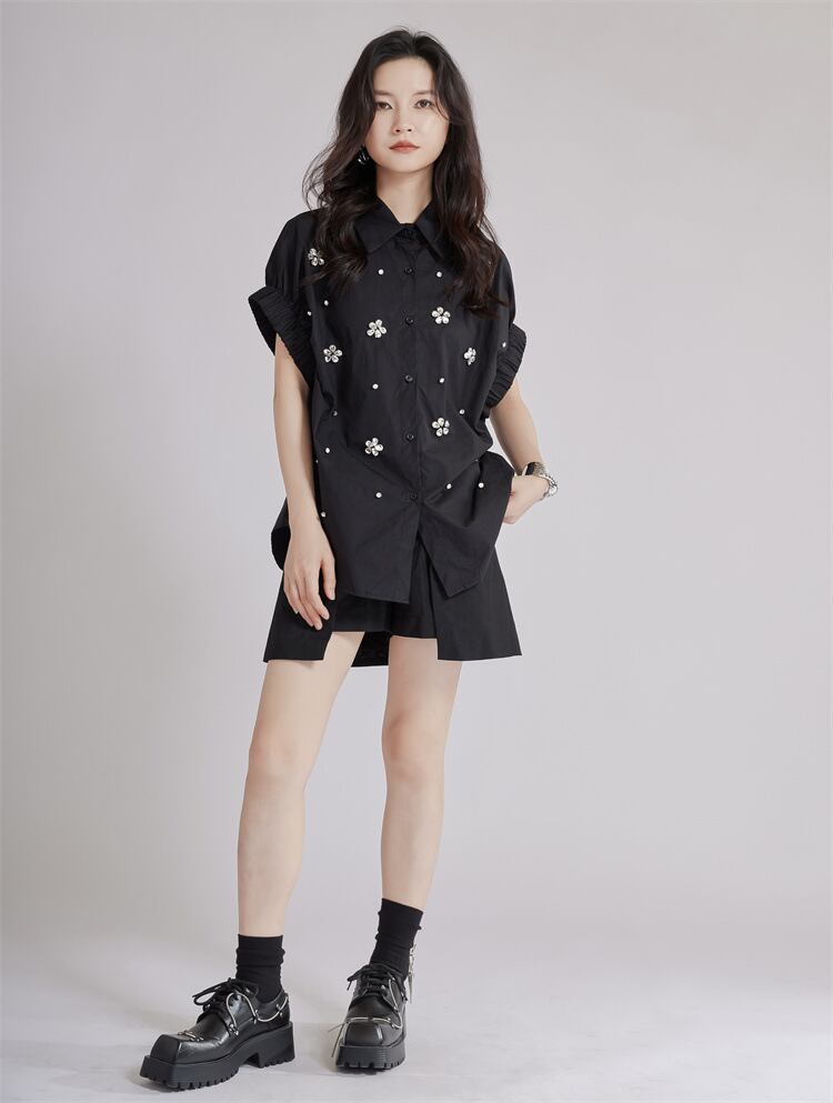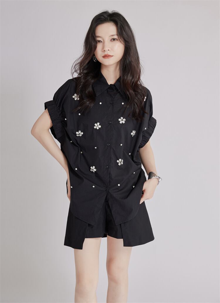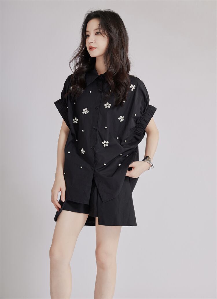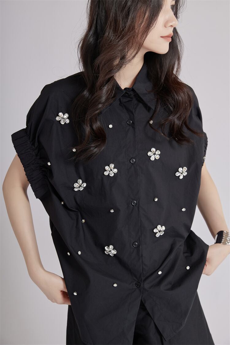 ビジューデコレーション シャーリングスリーブ 半袖ブラウス ブラック BL00221