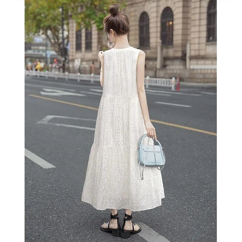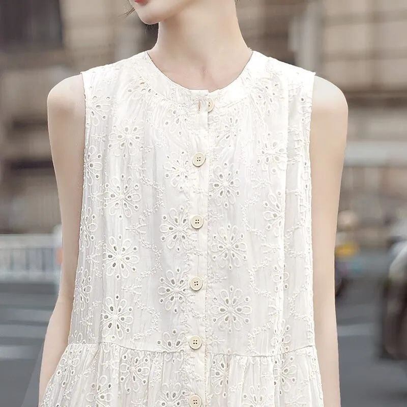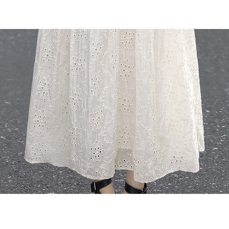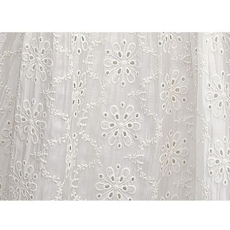 夏の日差しがよく似合う、ホワイトのロマンティックレースがフェミニンなロングワンピースです。ウエストと膝上のフレアの切替でスタイルアップも叶います。汗をかいても、サラっと過ごせる布地と通気性の良いデザインで、暑い真夏もさわやかに過ごせます。