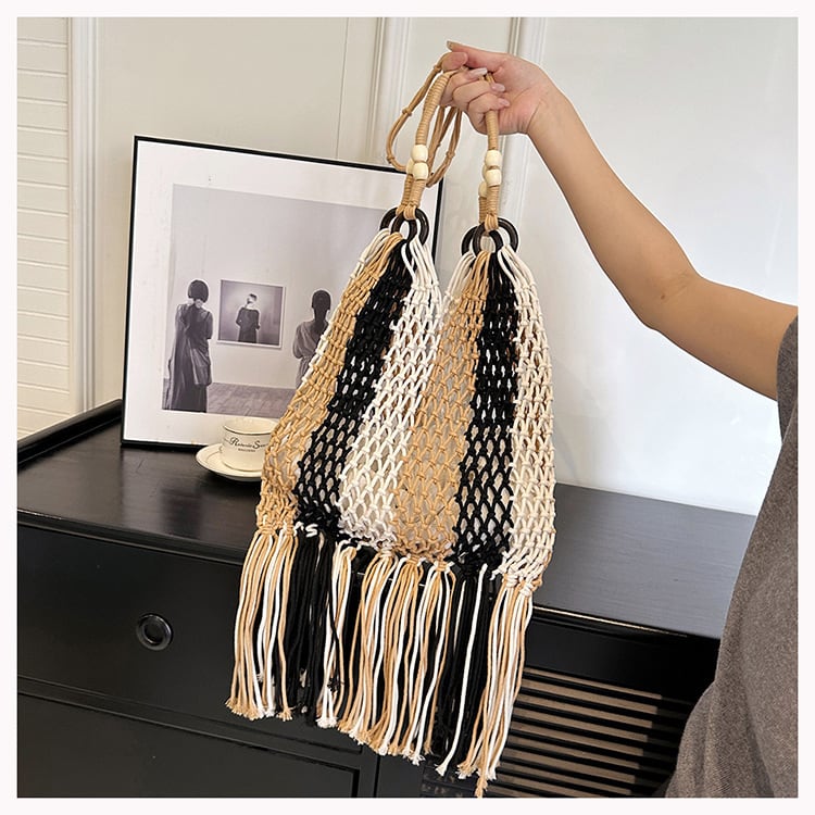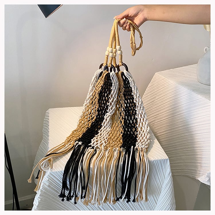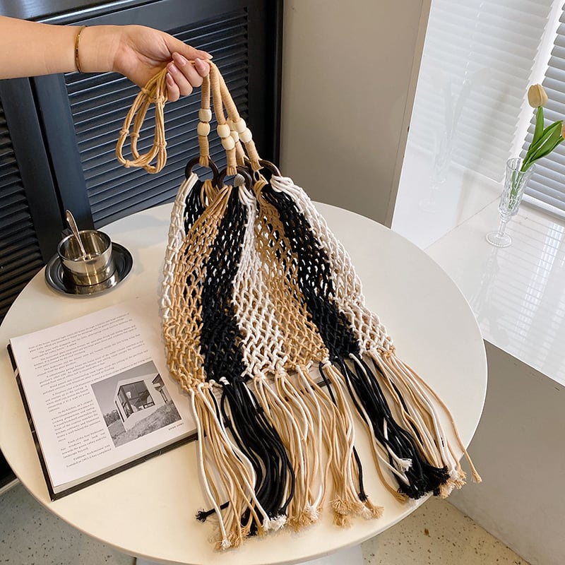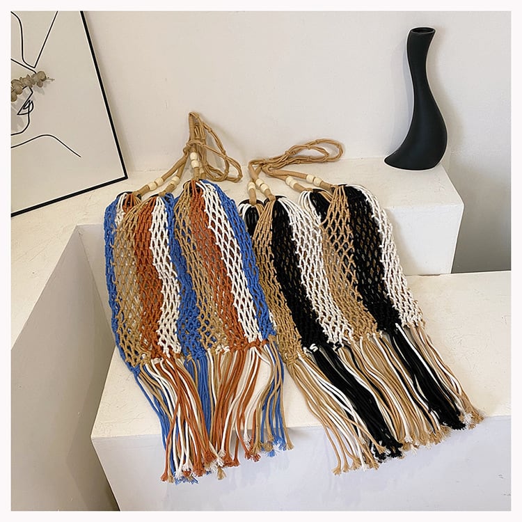 キャンプや登山で使用するクライミングロープを編み込んだユニークなメッシュバッグです。伸縮性があり、見た目よいもすっきりと荷物を収納できます。ドレッシーなスタイルのにも、デニムなどのカジュアルなコーデにもよく似合います◎ 使いやすいマルチカラーで、コーディネートのアクセントにおすすめのメッシュバッグです。