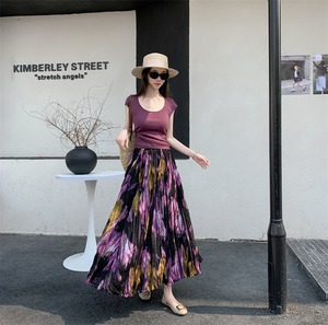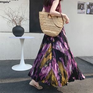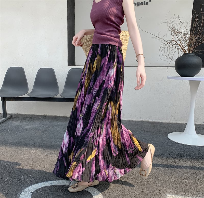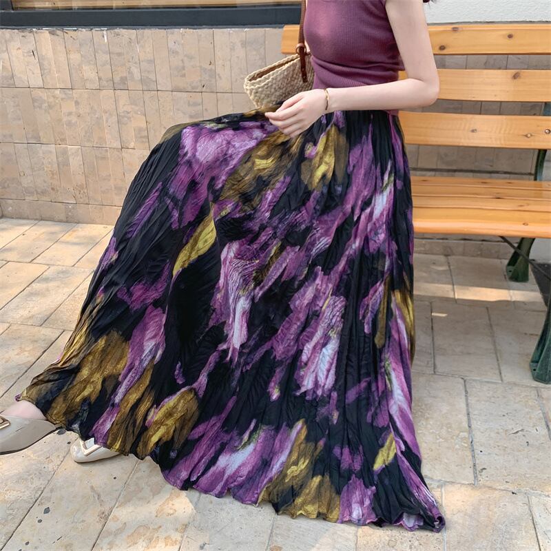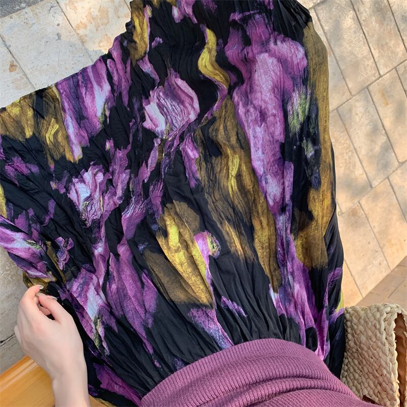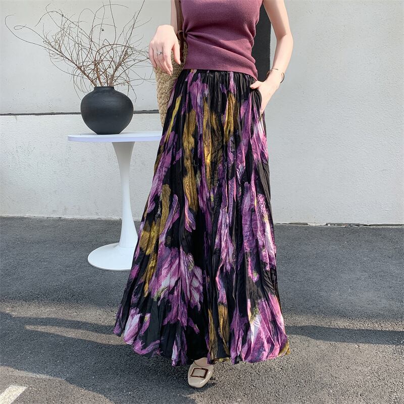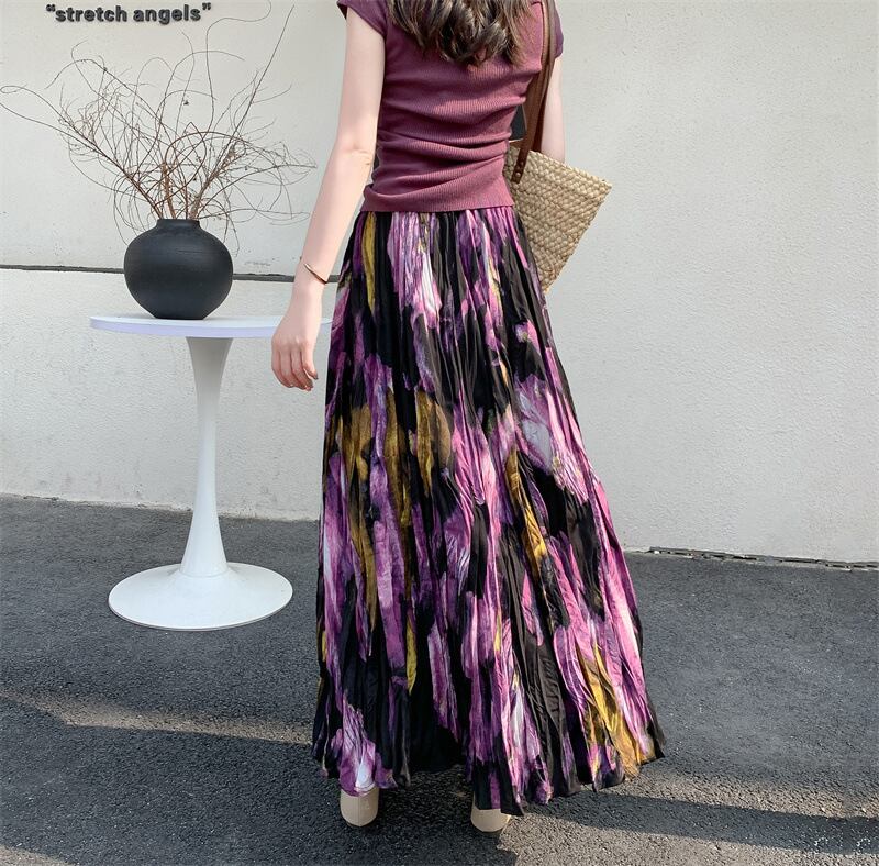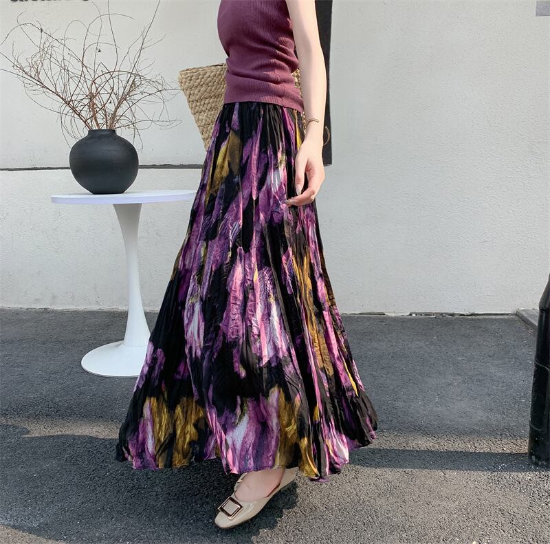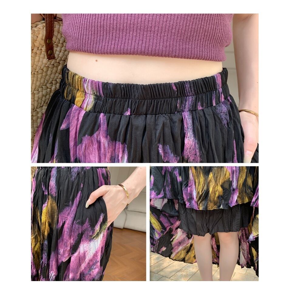 ブラックとパープルを基調としたフローラルペインティングがエレガントなロングフレアスカートです。品のある花柄のモチーフと程よいシフォンのボリュームでスタイルアップも叶います。エレガントやドレッシーなスタイルから、Tシャツ+スニーカーなどのカジュアルなスタイルにもよく似合います◎