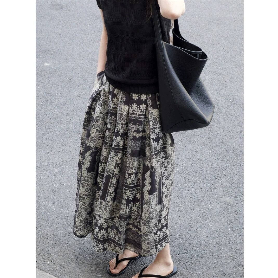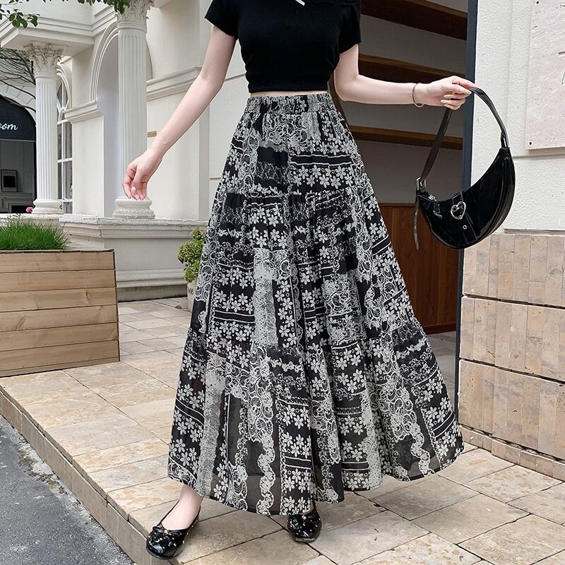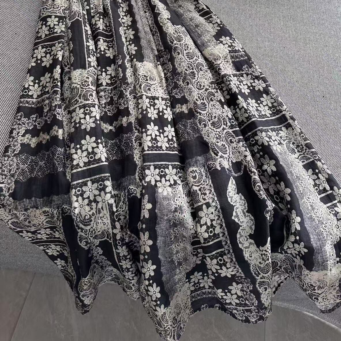 ペイズリーレースプリント ロングフレアスカート ブラック SK00271