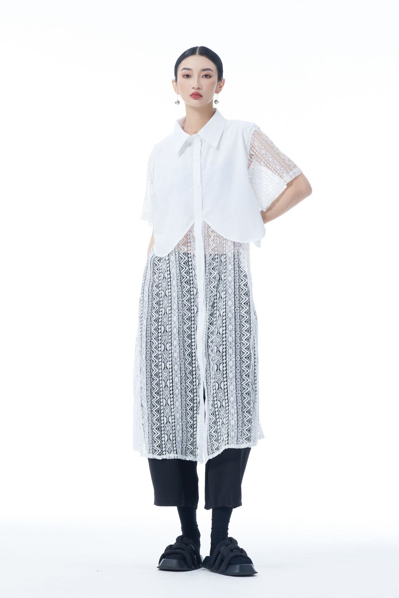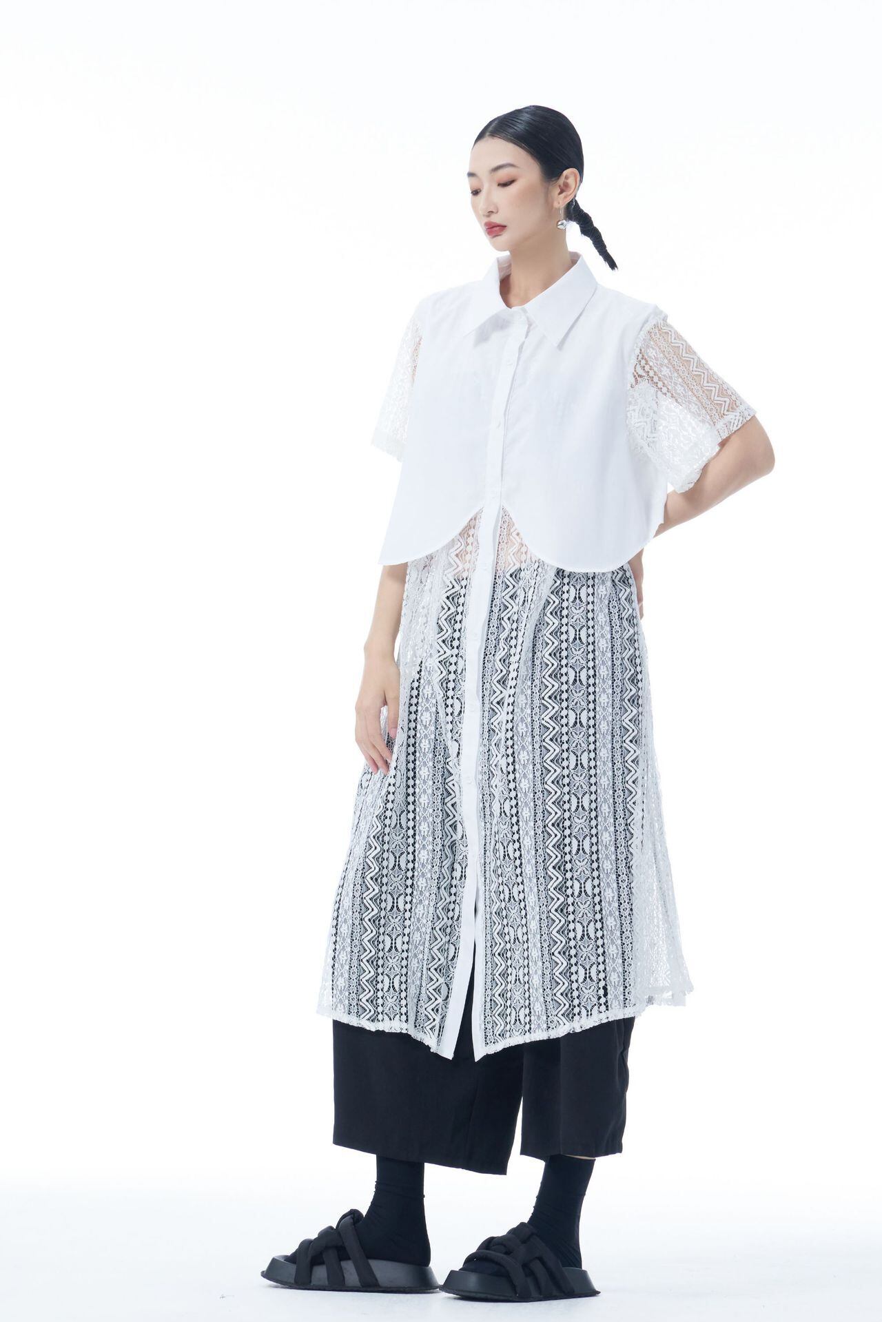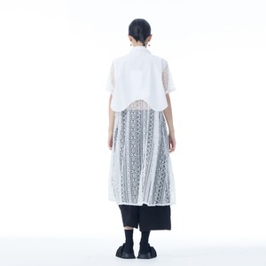 ブラウスとレースをドッキングしたロング丈のワンピースです。袖と裾のレースの透け感を活かしたユニークなデザインとオーバーシルエットでインパクトのあるスタイルが完成します。細部までハイセンスなデザインと着心地の良さが魅力です。ボトムスはもちろん、ニットやカーディガン、ジャケットなどのアウターとのレイヤードで、1年を通して幅広いスタイリングが楽しめます♪
