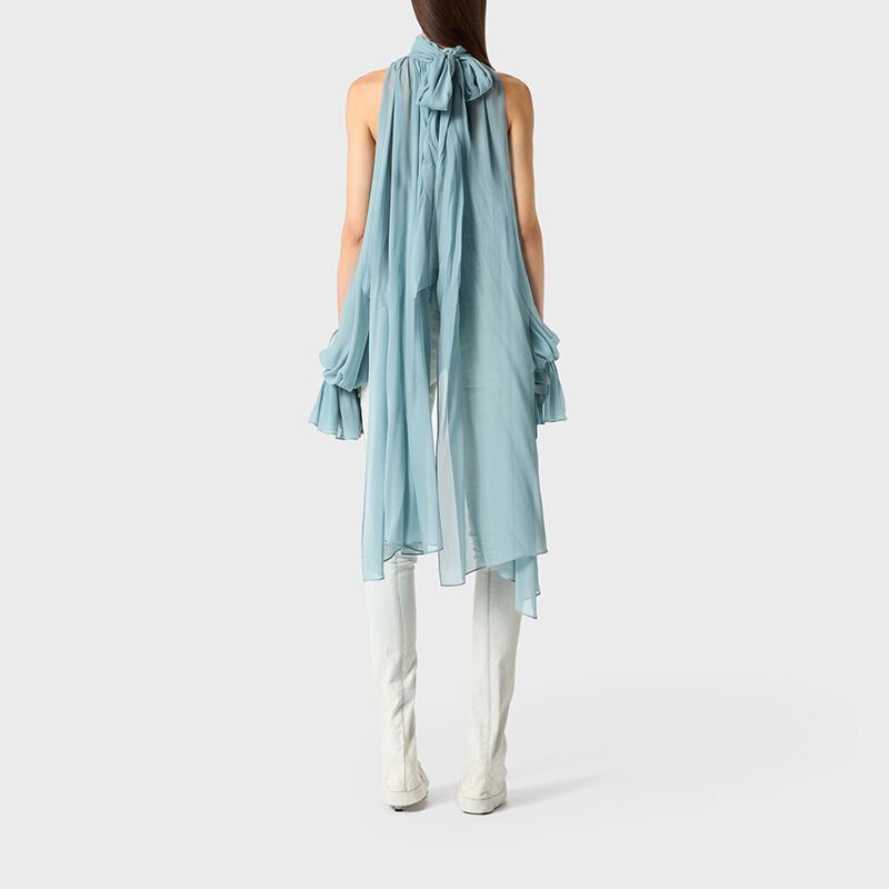 リボンタイ+カットアウトスリーブがエレガントなシフォントップスです。ボリュームのあるリボンタイや袖口のカットアウトとシャーリング、アシンメトリーな着丈など、細部まで美しいデザインです。パンツでもスカートでも、合わせやすく、ジャケットのインナーとしても、1年を通して幅広いスタイリングが楽しめます◎