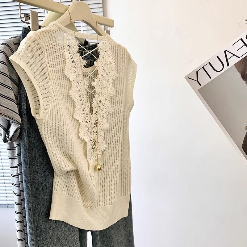フレンチレース+レースアップ リバーシブル半袖ニットトップス ライトベージュ CS00181