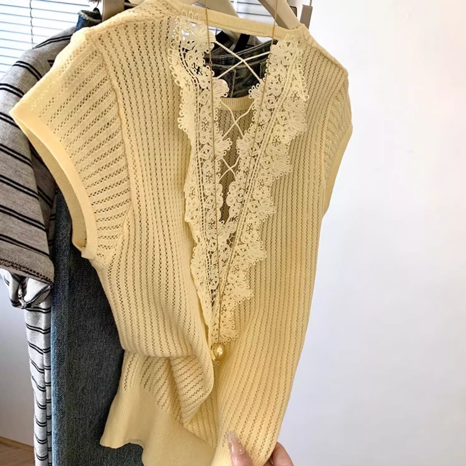 フレンチレース+レースアップ リバーシブル半袖ニットトップス マスタード CS00180