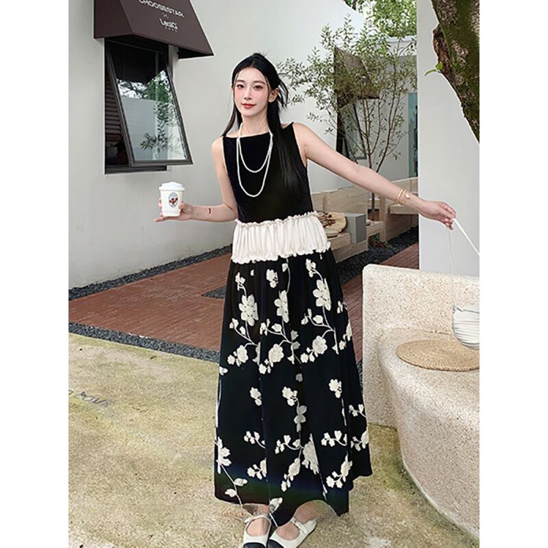フローラルプリント+ウエストスイッチ ノースリーブ ロングワンピース ブラック/ホワイト OP00397