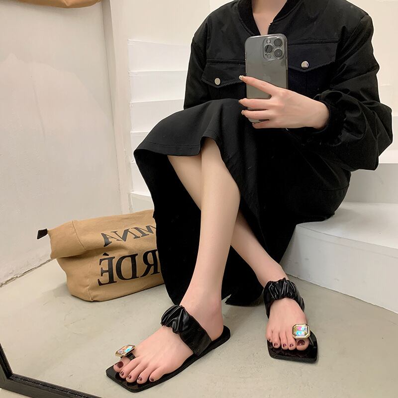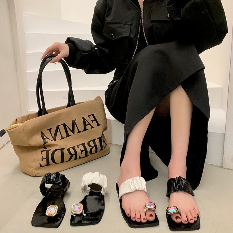 親指のスクエアビジューとシャーリングストラップがエレガントなトングフラットサンダルです。ワイドなストラップで歩きやすさも◎です。夏のコーディネートのアクセントにもおすすめのユニークなデザインです。
