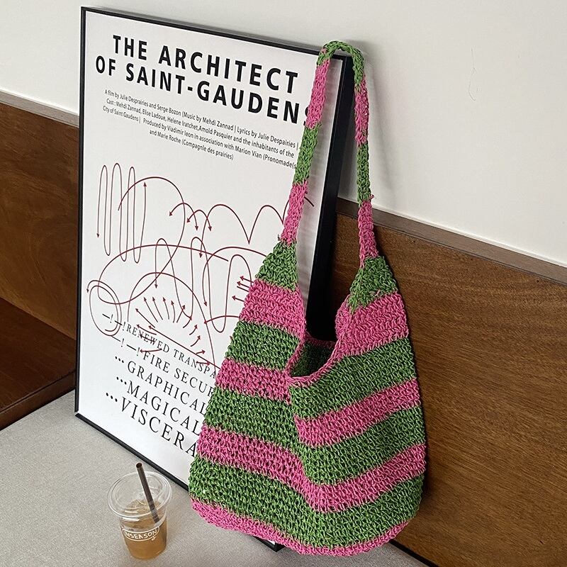 ストロー素材とピンク×グリーンのボーダーがスタイリッシュなショルダーバッグです。シンプルなデザインとヴィヴィッドカラーでコーディネートのアクセントにおすすめです。伸縮性のある素材ですので、見た目よりも荷物をすっきり収納できます◎ 1年を通してお使いいただけます。