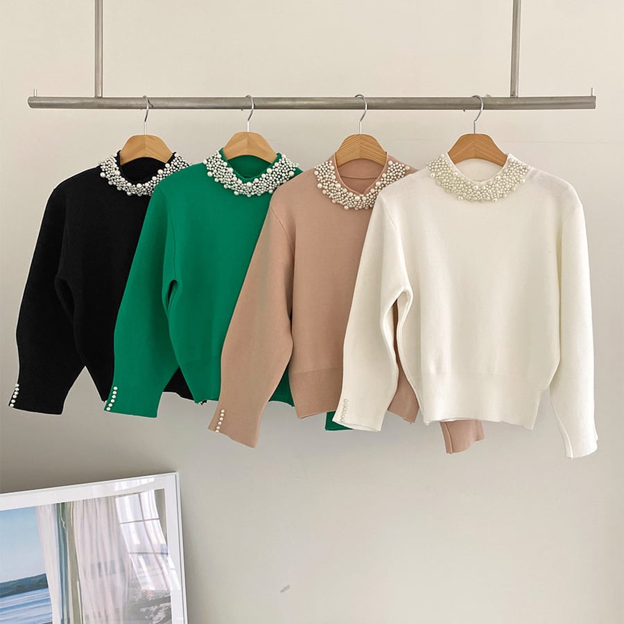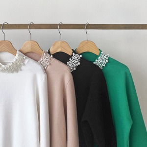 首元のパールデコレーションがエレガントなニットセーターです。袖口にもパールがアレンジされており、フェミニンな雰囲気に仕上がります。パンツでも、スカートでもお手持ちのボトムスとスタイリングしやすいシンプルなデザインです。