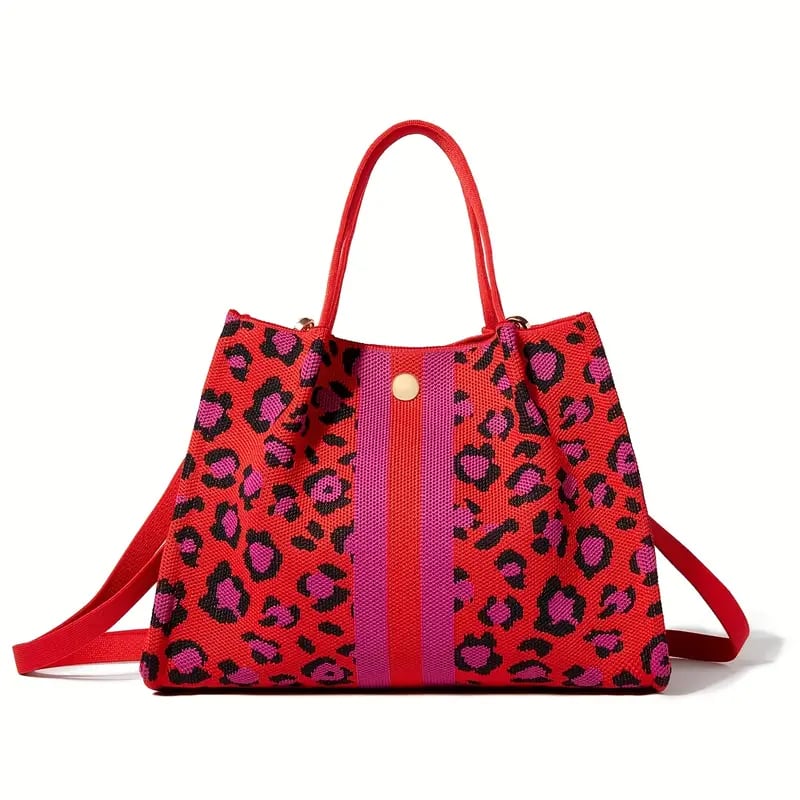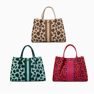 ヴィヴィッドなカラーリングのレオパード柄とストライプがアクセント、スタイリッシュなトートバッグです。付属のショルダーストラップでショルダーバッグとして2wayにお使いいただけます。マチも広く、見た目よりすっきりと荷物を収納できます。ニット素材で軽く、汚れても自宅でお洗濯が可能です。1年を通して、コーディネートのアクセントにぴったりのユニークなデザインです。