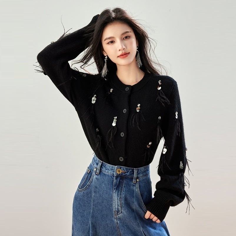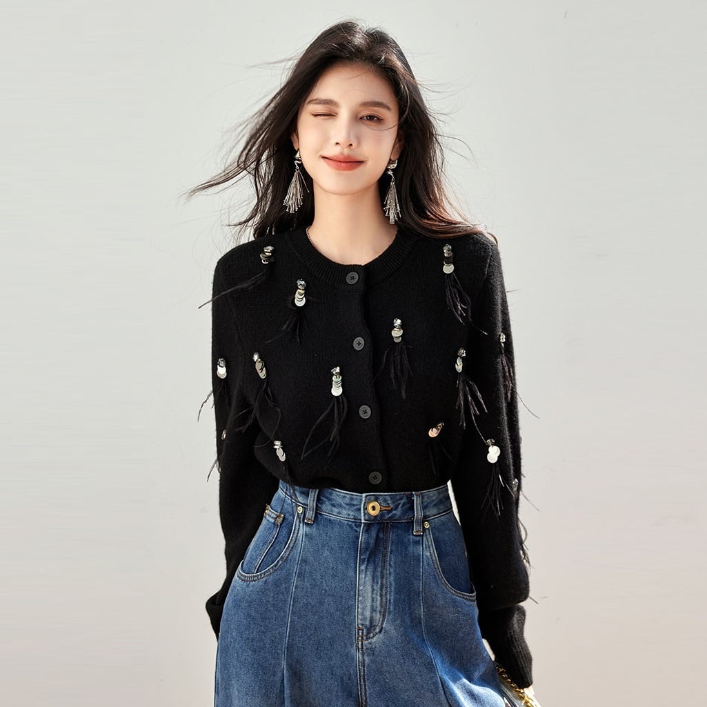 スパンコール+フェザーデコレーション ニットカーディガン ブラック NI00435