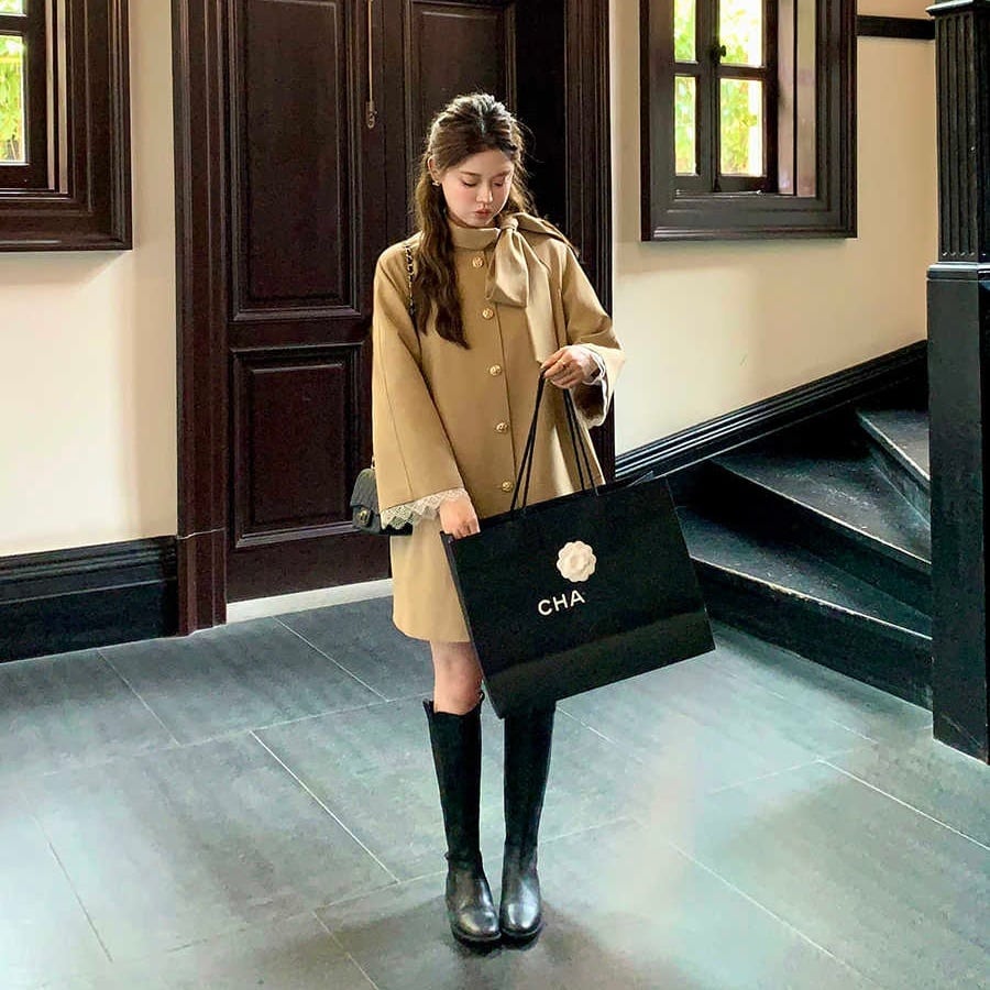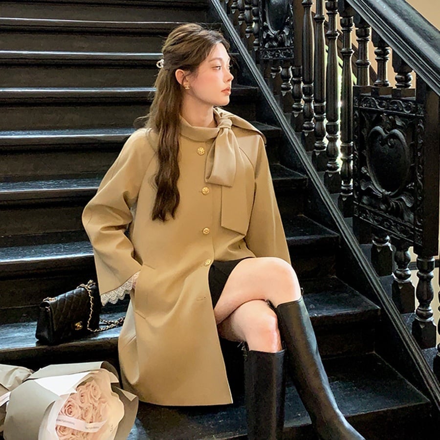 衿元のリボンと袖口にレースのついたベルカラーなど、フェミニンなデザインのミドルコートです。こだわりのデザインと美しい控えめAラインのシルエットが魅力です。ブーツやワンピースなど、フェミニンなスタイリングはもちろん、デニムとスニーカーなどのカジュアルなアイテムとも相性ばつぐんです、幅広いスタイリングが楽しめます。