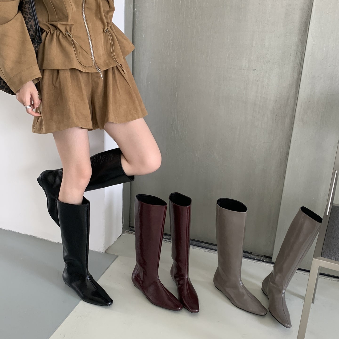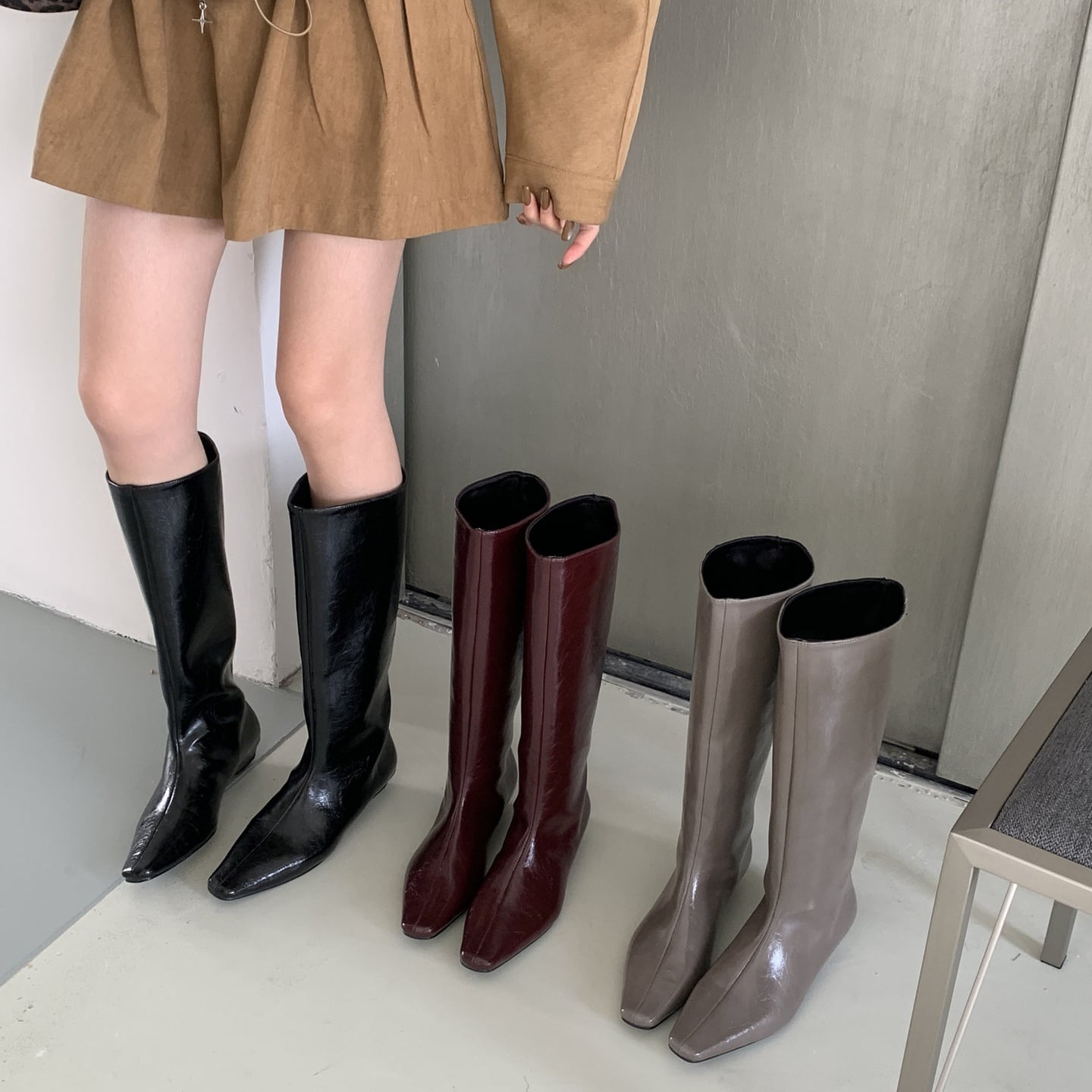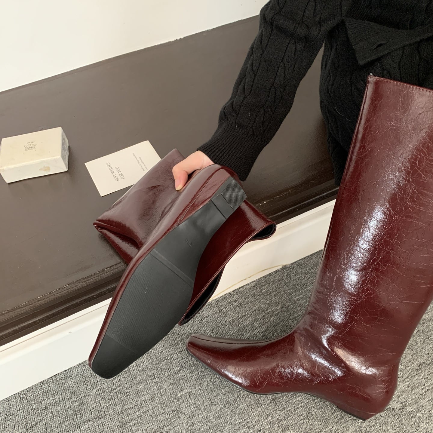 クラックレザー スクエアトゥ レザーロングブーツ バーガンディー BU00090