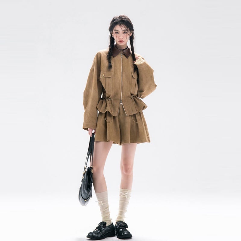 コードストリング ジッパージャケット+ショートパンツ セットアップ ブラウン SU00086