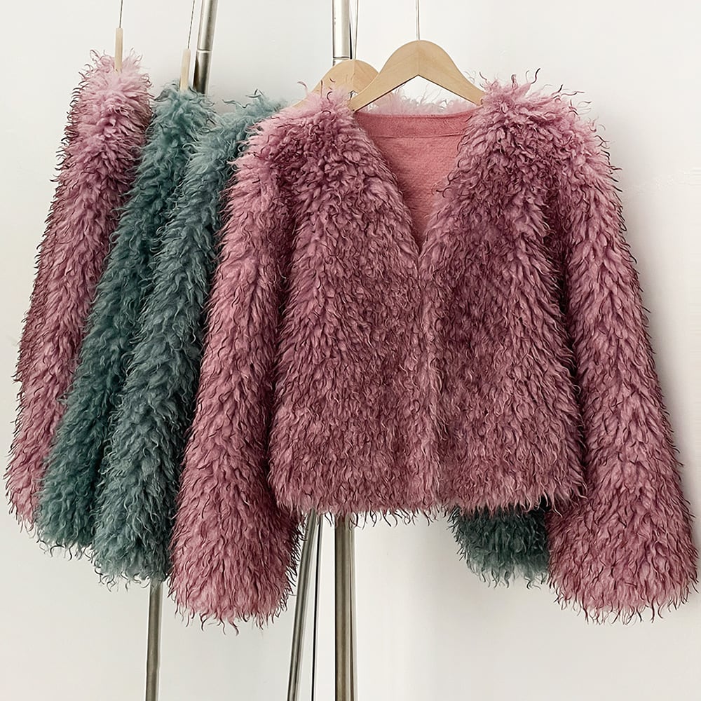 毛足がカールしたカーリーエコファーのショート丈のノーカラーコートです。しっかりとした糸を使用し、シルエットも美しく、高級感のある仕上がりです。裏地にはエコスウェードを使用しており、防寒性も◎です。デニム+スニーカーでも、スカート+ヒールパンプスでも、スタイルを問わず、オールマイティーにお使いいただけるデザインです。