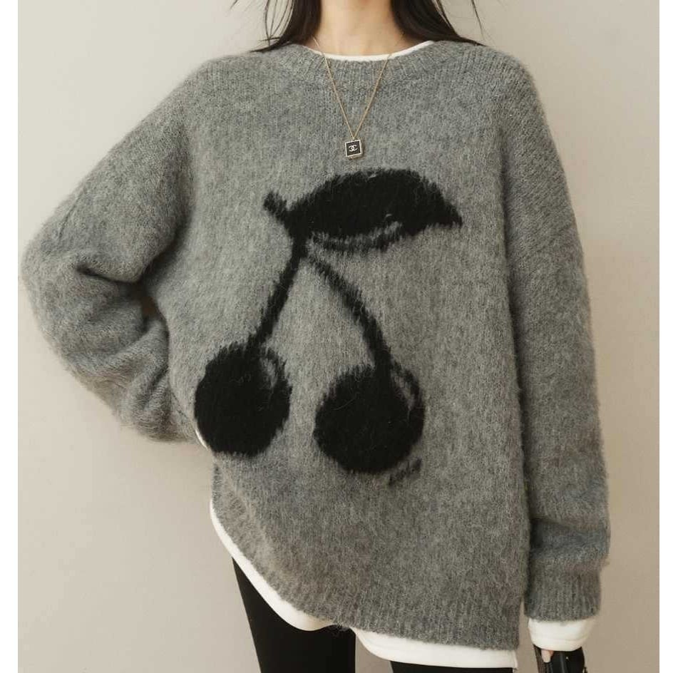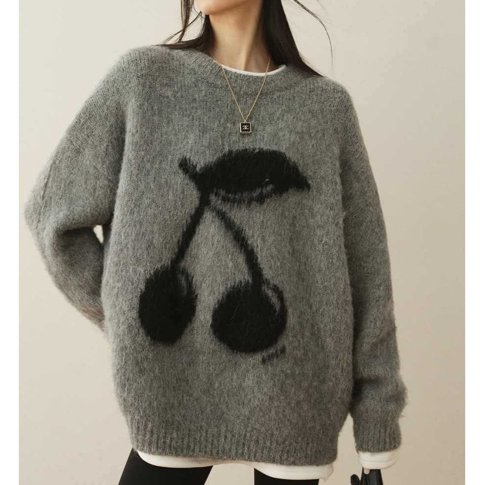 チェリーモチーフ クルーネックニットセーター グレー NI00442