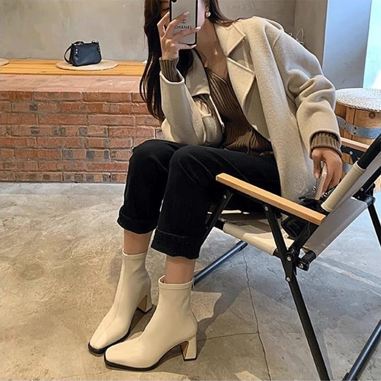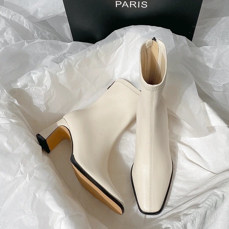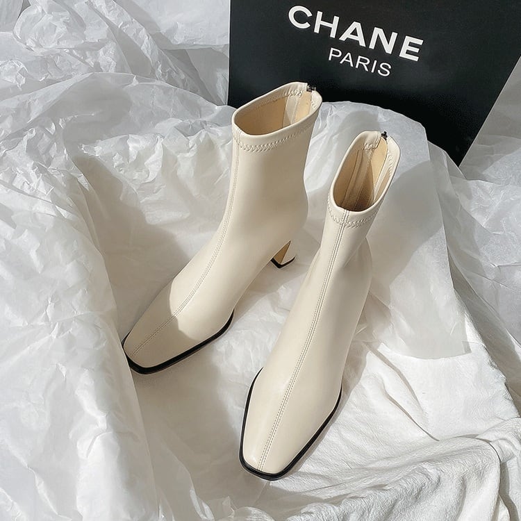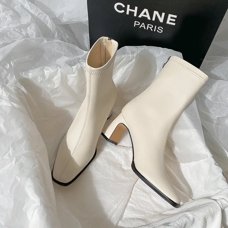 ストレッチエコレザー スクエアトゥ デザインヒールショートブーツ アイボリー BU00108