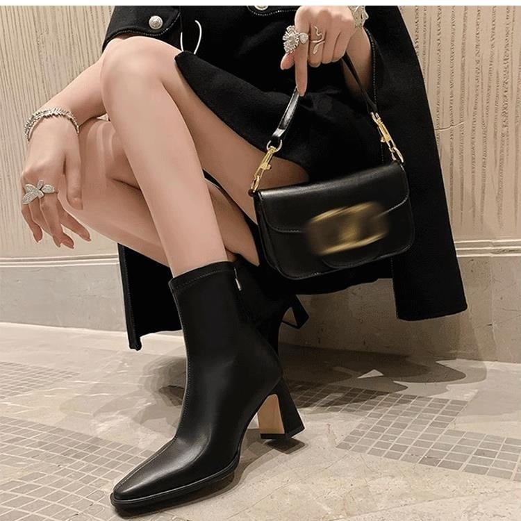 ストレッチエコレザーを使用したスクエアトゥのショートブーツです。ソフトなストレッチ素材が脚にフィット、スクエアトゥとデザインヒールが足元をスタイリッシュに見せてくれます。秋冬のコーディネートにぴったりのハイセンスなデザインです。しっかりした7cmヒールで歩きやすさも◎です。お手入れがしやすく、雨の日も安心のエコレザーです。