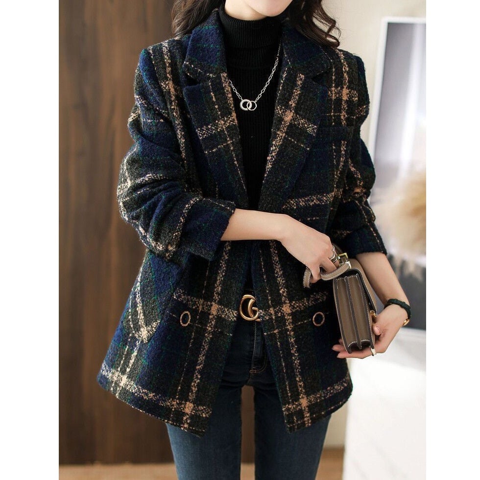 ネイビーとグリーンのチェックがエレガントなツイードのダブルボタンジャケットです。落ち着いたネイビーのチェックが秋冬のコーデに良く似合います。素材感やボタンなど細部までラグジュアリーでハイセンスなデザインです。デニムなどカジュアルなアイテムとも相性が◎、幅広いスタイリングが楽しめます。