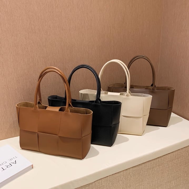 エコレザーを編み込んだ、スタイリッシュなデザインがポイントのラージサイズのトートバッグです。マチも広く、A4サイズの書類などもすっきりと収納できます。ストリング開閉式で、荷物を落としたりする心配もありません。軽くお手入れのしやすいエコレザーです。1年を通して幅広いスタイリングが楽しめます。通勤用バッグにもおすすめです。