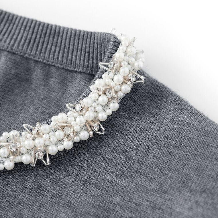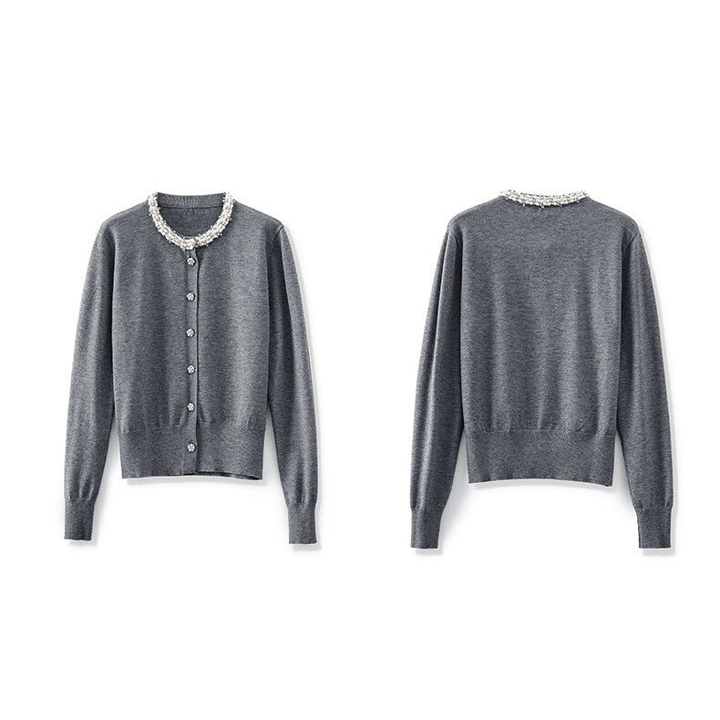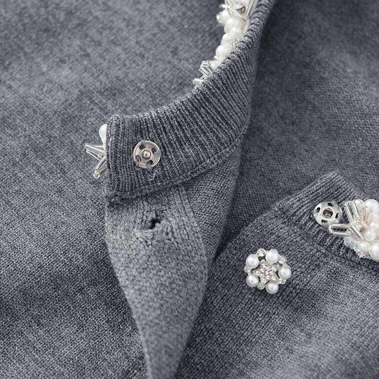 衿元とボタンのビーズデコレーションがフェミニンなニットカーディガンです。派手すぎず、品のあるビーズアレンジや、ちょうど良い袖口と首元のリブなど、細部までこだわりのデザインです。ウール混で温かく、かつチクチクしにくい肌にやさしい素材を使用しています。1年を通して幅広いスタイリングが楽しめる優秀なニットトップスです。