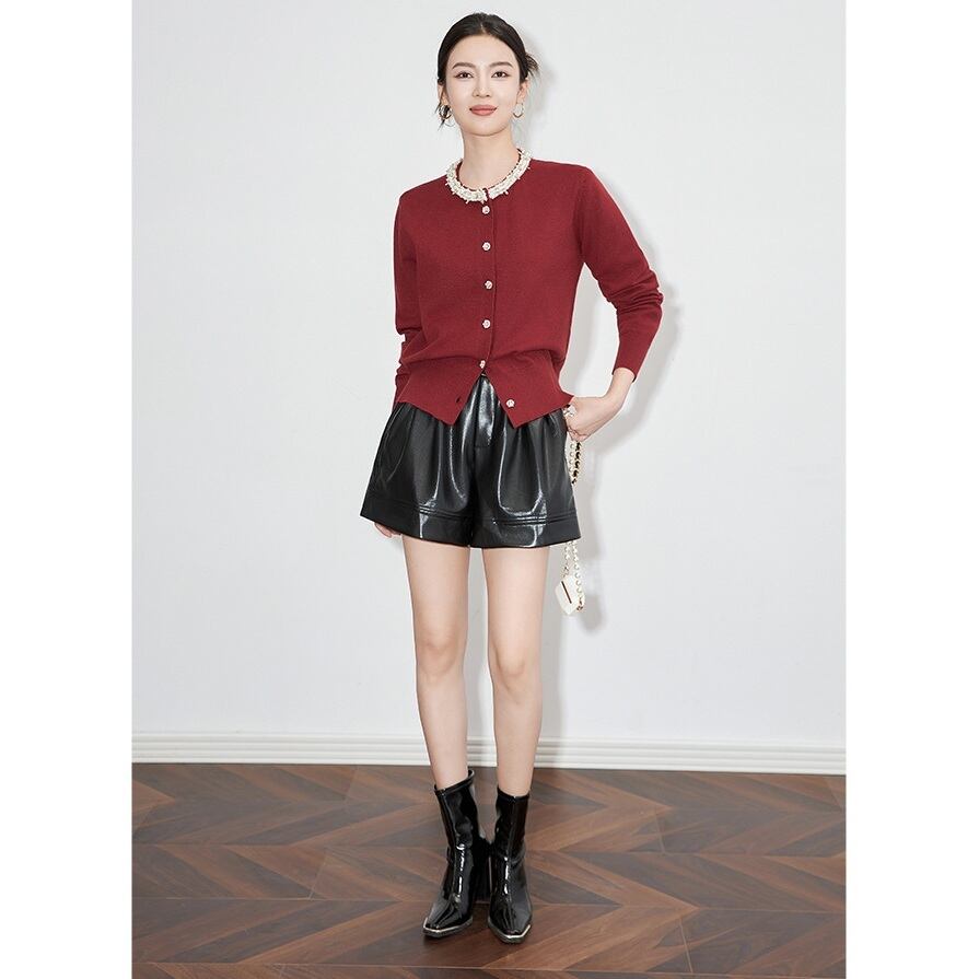 ビーズデコレーション クルーネック ニットカーディガン バーガンディー NI00433