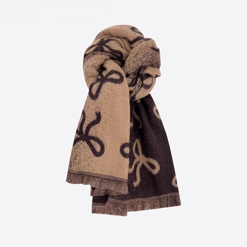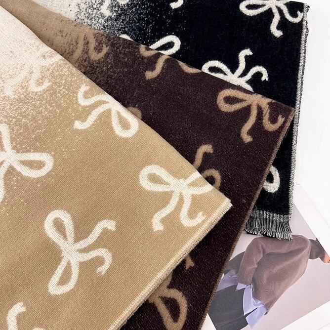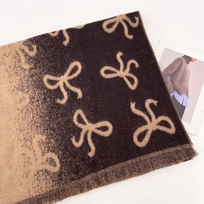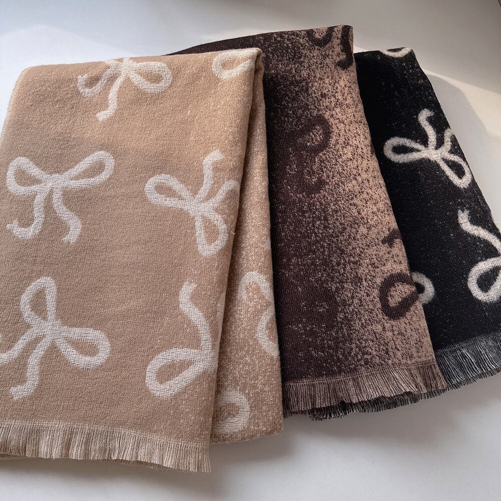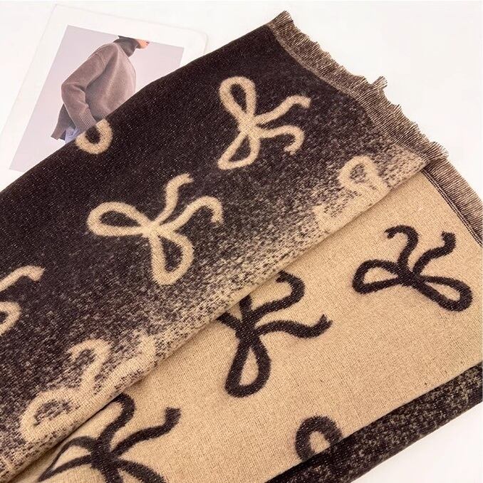 リボンモチーフとカラーグラデーションがポイントのワイドマフラー・ストールです。巻き方や柄の出し方によって雰囲気がかわり、スタイルに合わせてアレンジが楽しめます。少し肌寒い時に首に巻いたり、羽織ったり、ひざ掛けとしてもお使いいただけます。空調の強いオフィスや旅行先に1枚あると便利なアイテムです。肌ざわりの良いイミテーションカシミアを使用しており、お肌の弱い方にもおすすめです。